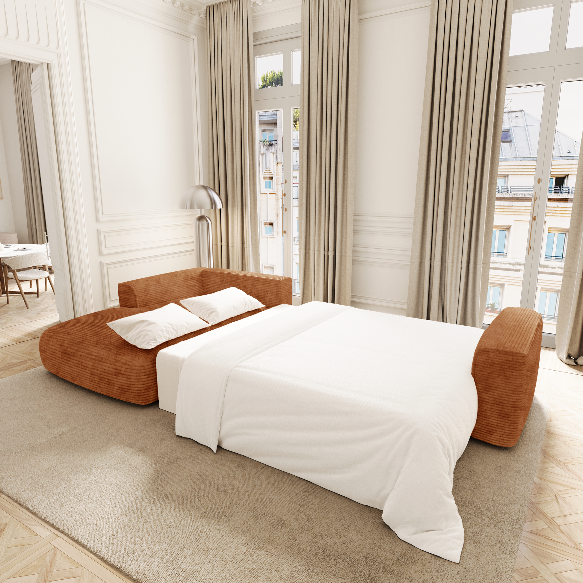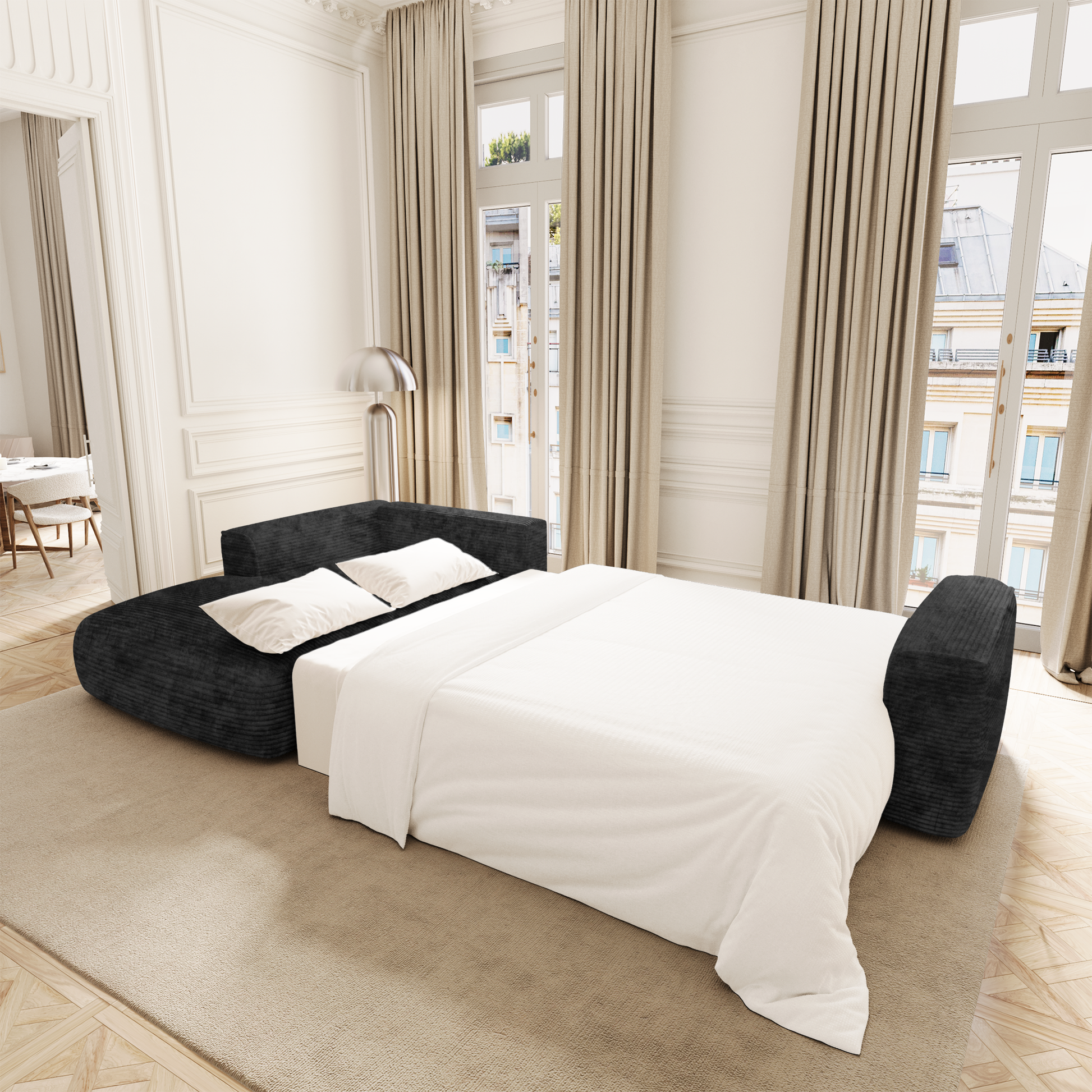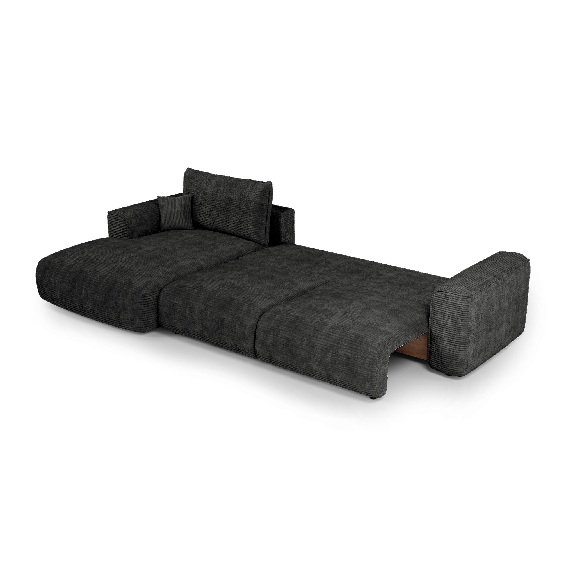 Le système de conversion est fluide et intuitif : en quelques gestes, COMO se transforme en couchage d’appoint confortable, idéal pour héberger vos invités ou profiter d’un moment de repos prolongé. Sous l’assise, un vaste coffre finition noyer accueille linge de lit, plaids ou coussins : une solution idéale pour optimiser l’espace au quotidien.