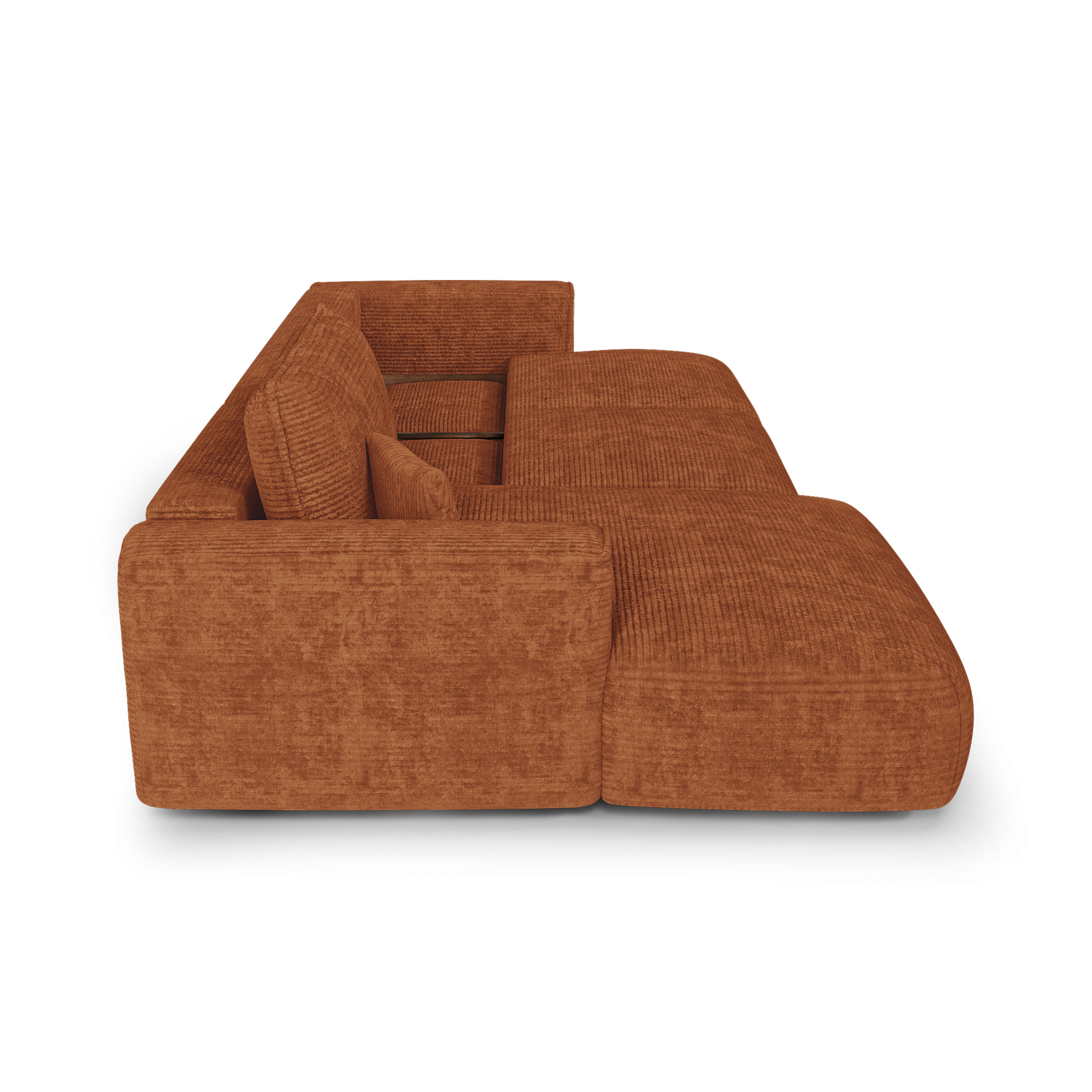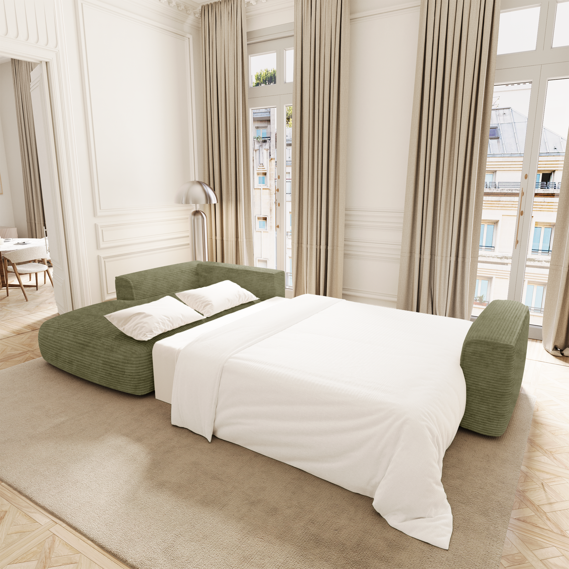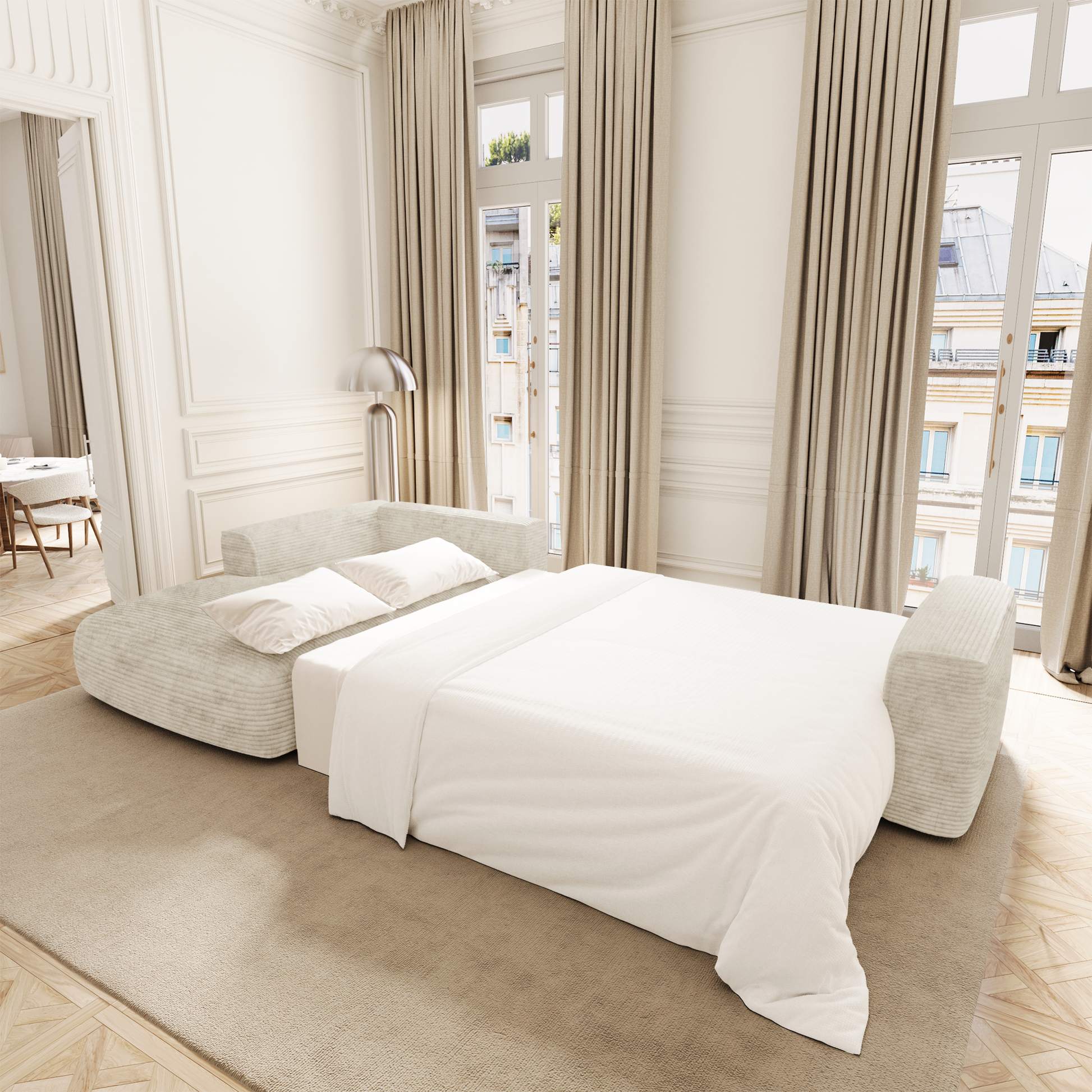Le système de conversion est fluide et intuitif : en quelques gestes, COMO se transforme en couchage d’appoint confortable, idéal pour héberger vos invités ou profiter d’un moment de repos prolongé. Sous l’assise, un vaste coffre finition noyer accueille linge de lit, plaids ou coussins : une solution idéale pour optimiser l’espace au quotidien.