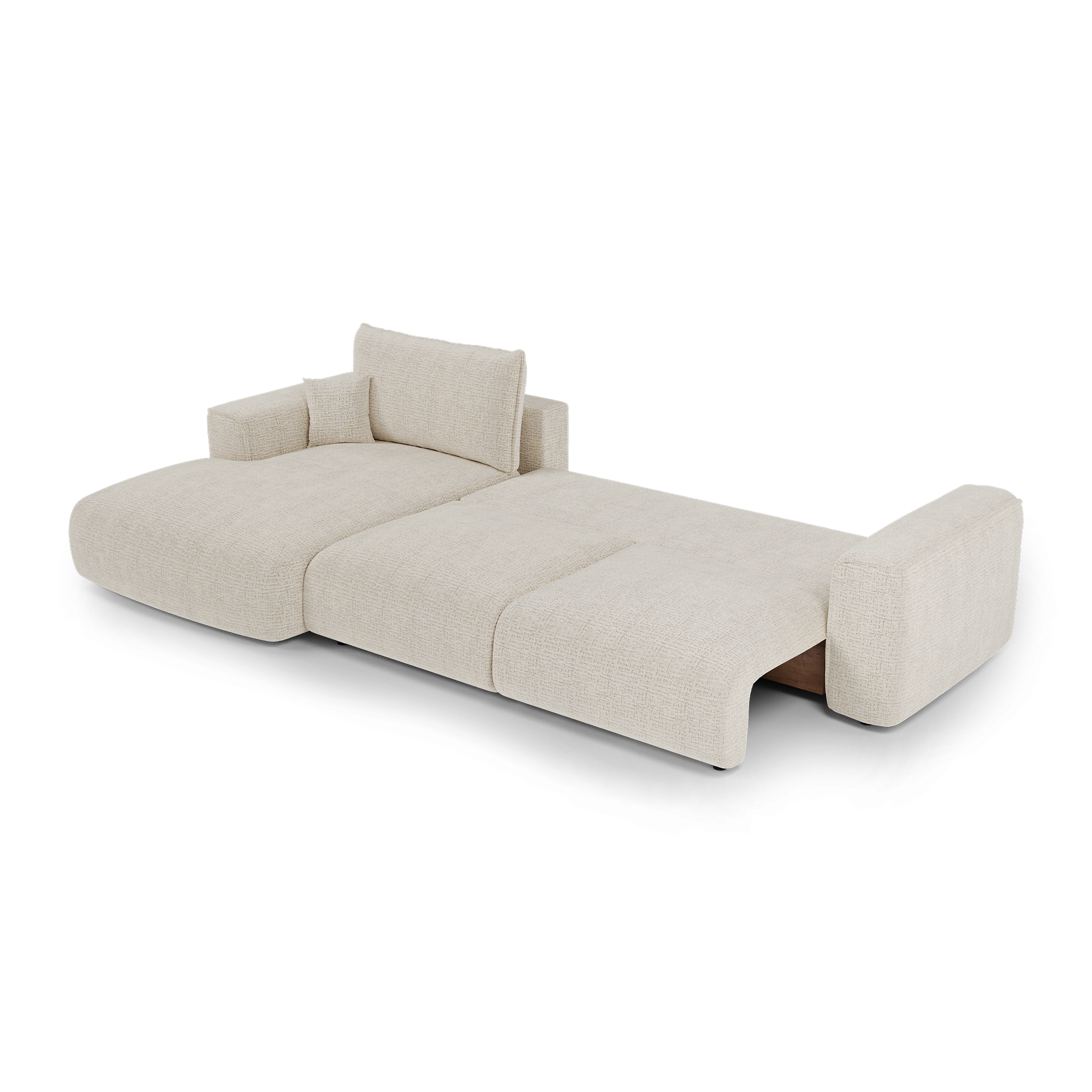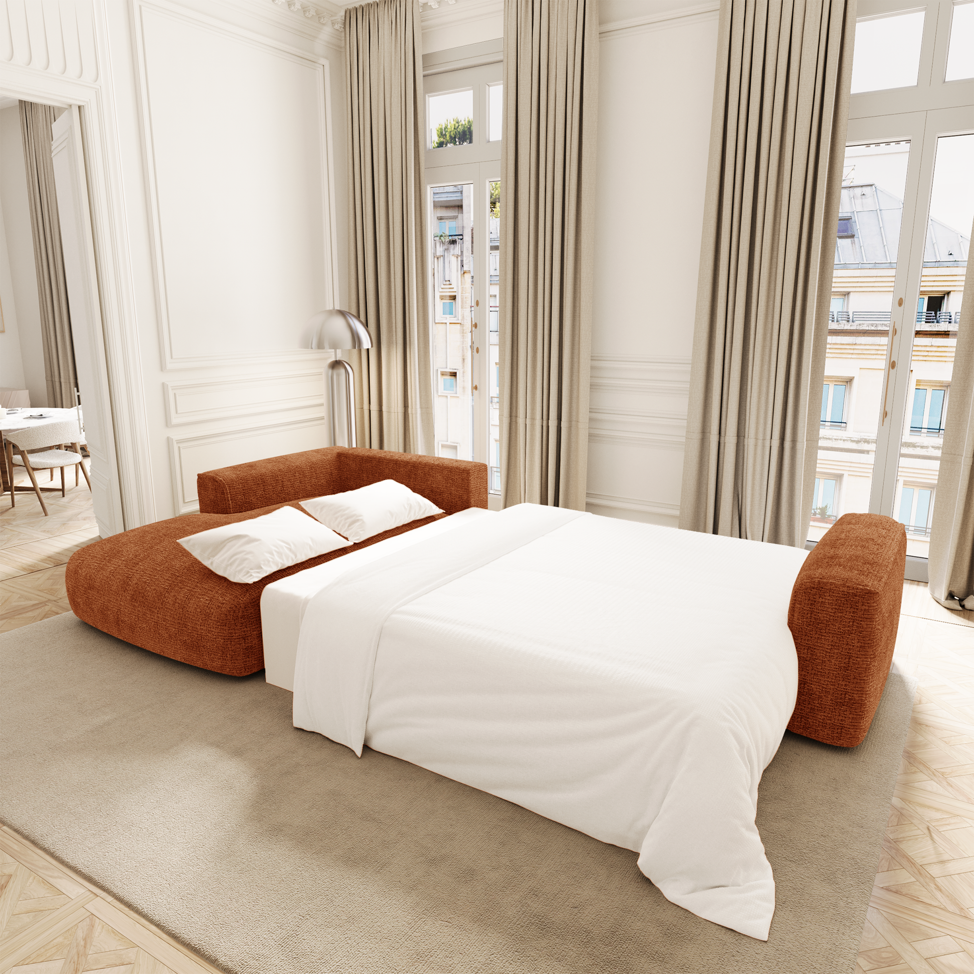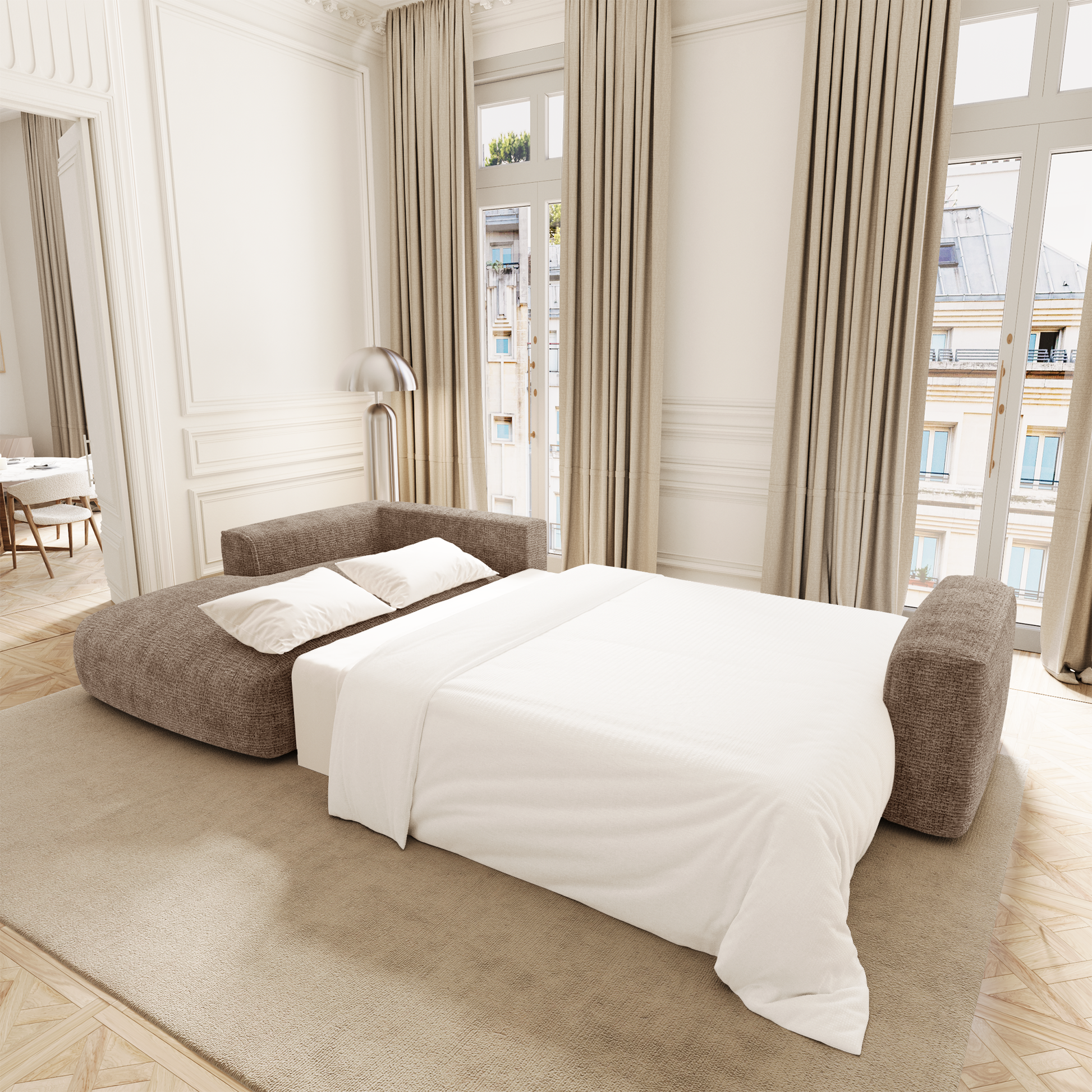 Le système de conversion est fluide et intuitif : en quelques gestes, COMO se transforme en couchage d’appoint confortable, idéal pour héberger vos invités ou profiter d’un moment de repos prolongé. Sous l’assise, un vaste coffre finition noyer accueille linge de lit, plaids ou coussins : une solution idéale pour optimiser l’espace au quotidien.