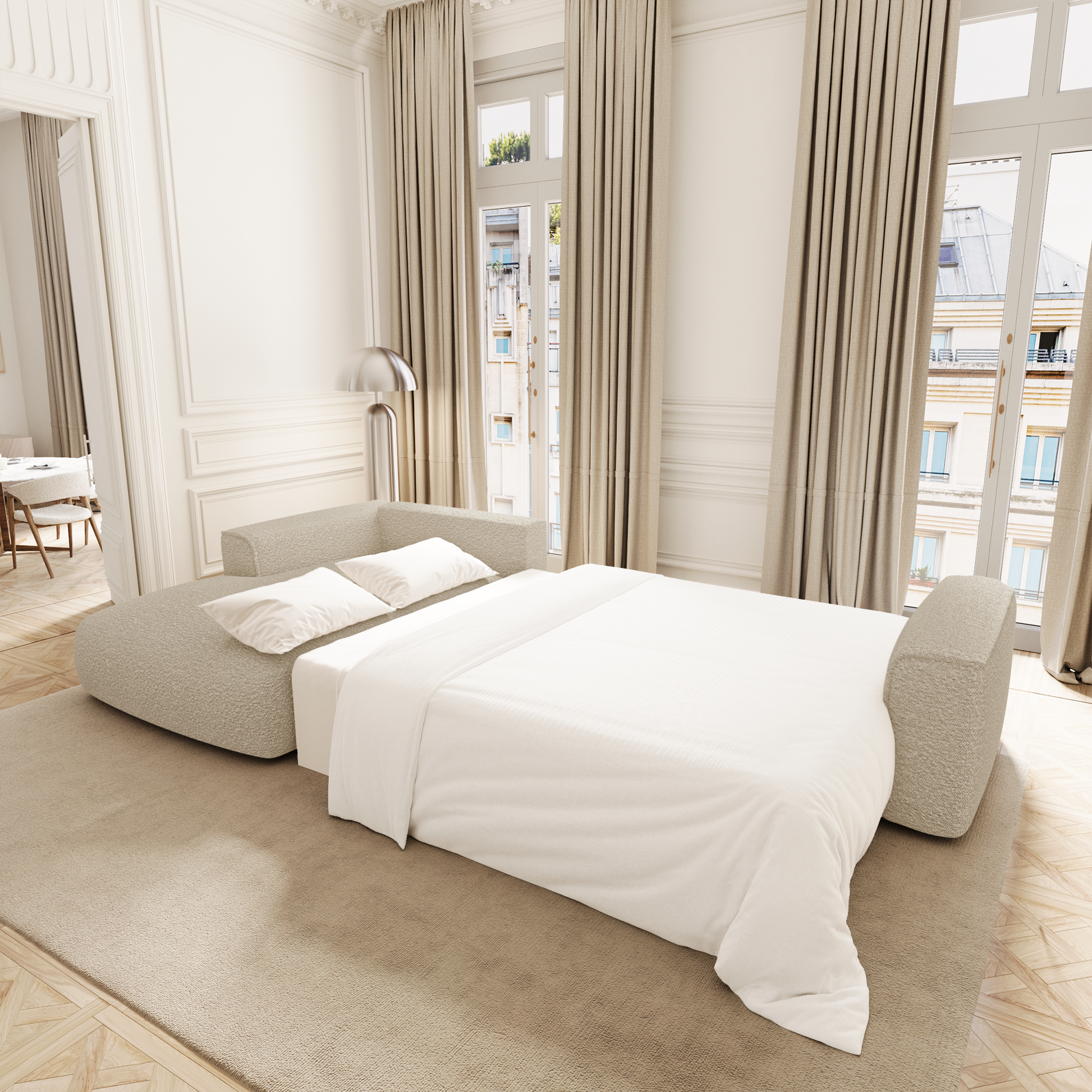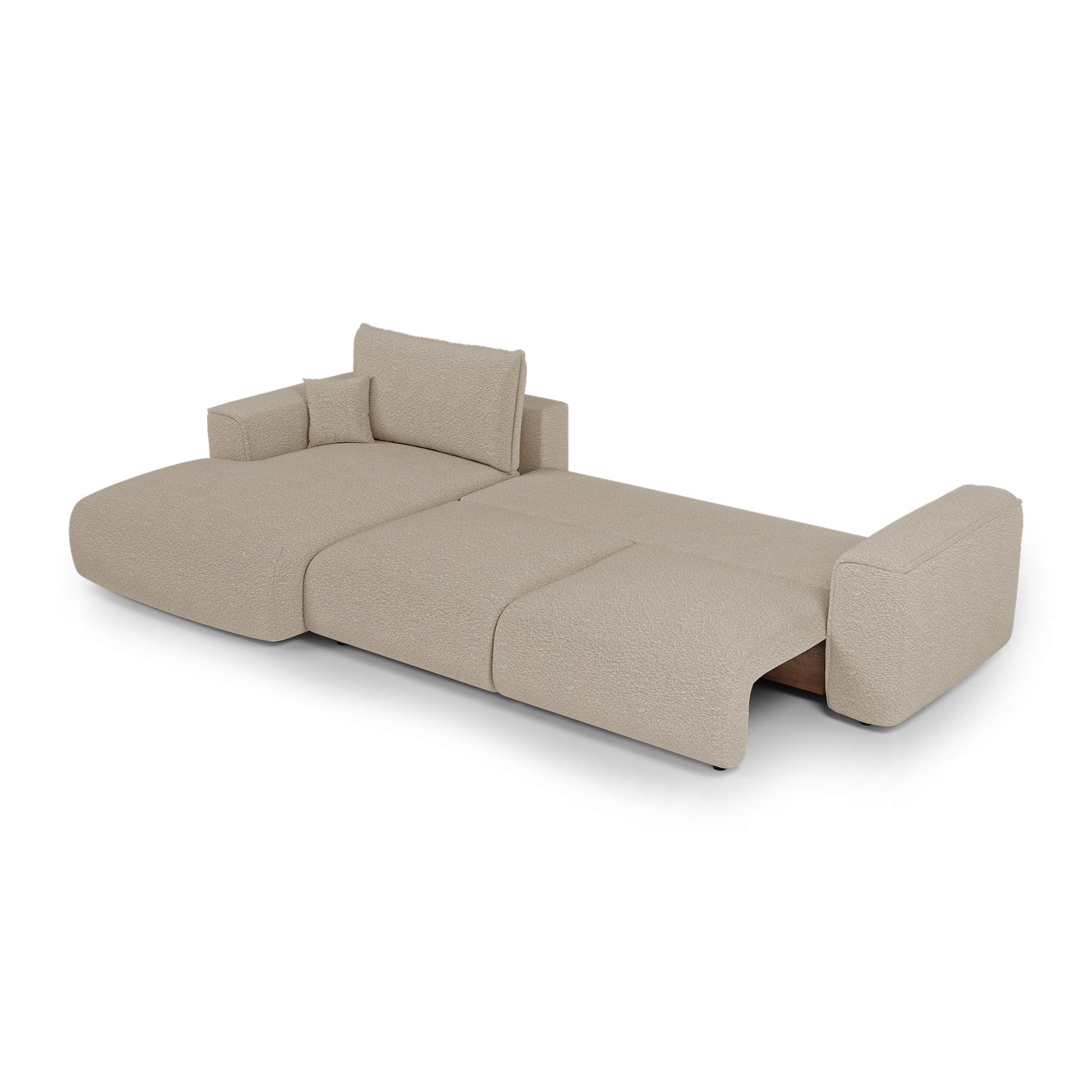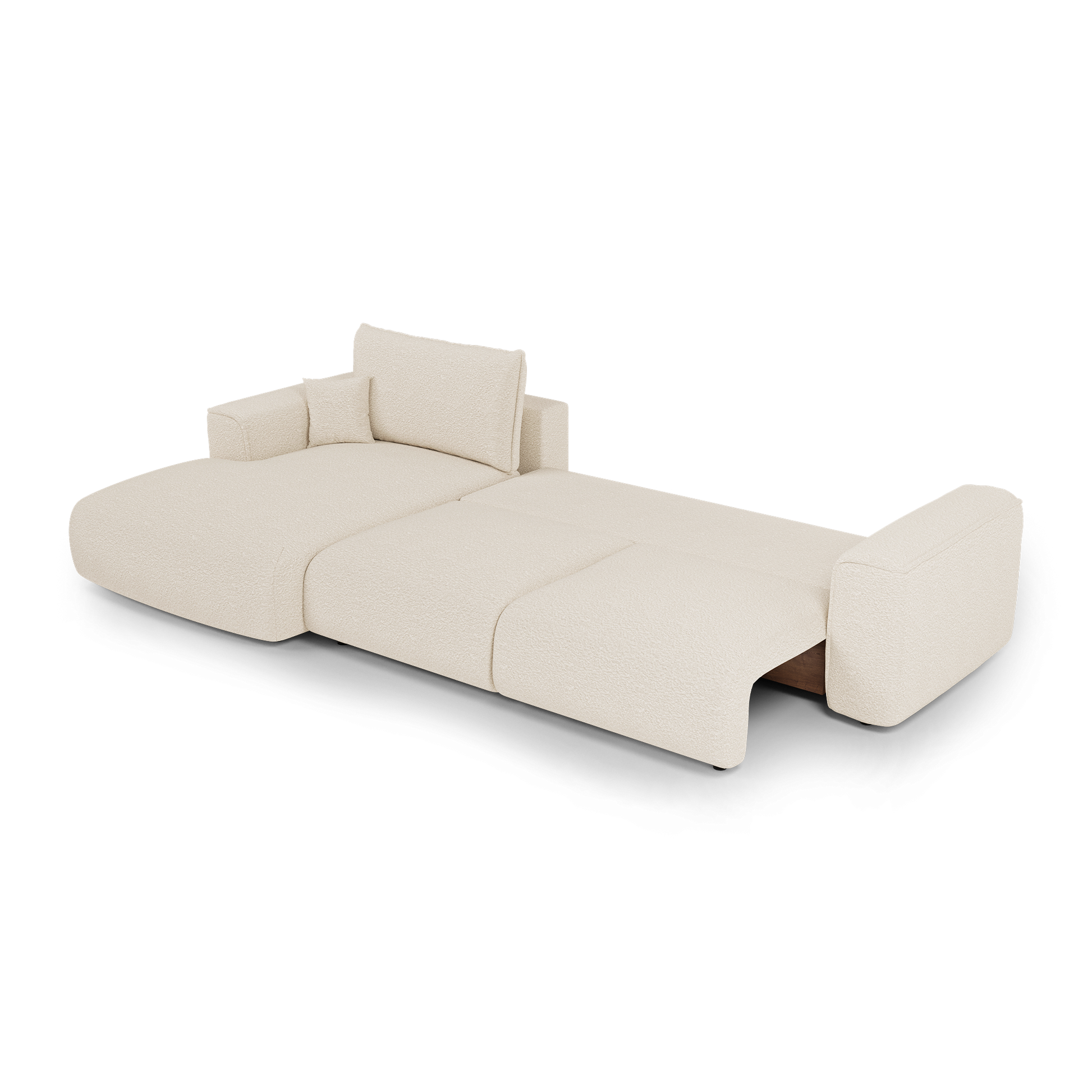 Le système de conversion est fluide et intuitif : en quelques gestes, COMO se transforme en couchage d’appoint confortable, idéal pour héberger vos invités ou profiter d’un moment de repos prolongé. Sous l’assise, un vaste coffre finition noyer accueille linge de lit, plaids ou coussins : une solution idéale pour optimiser l’espace au quotidien.