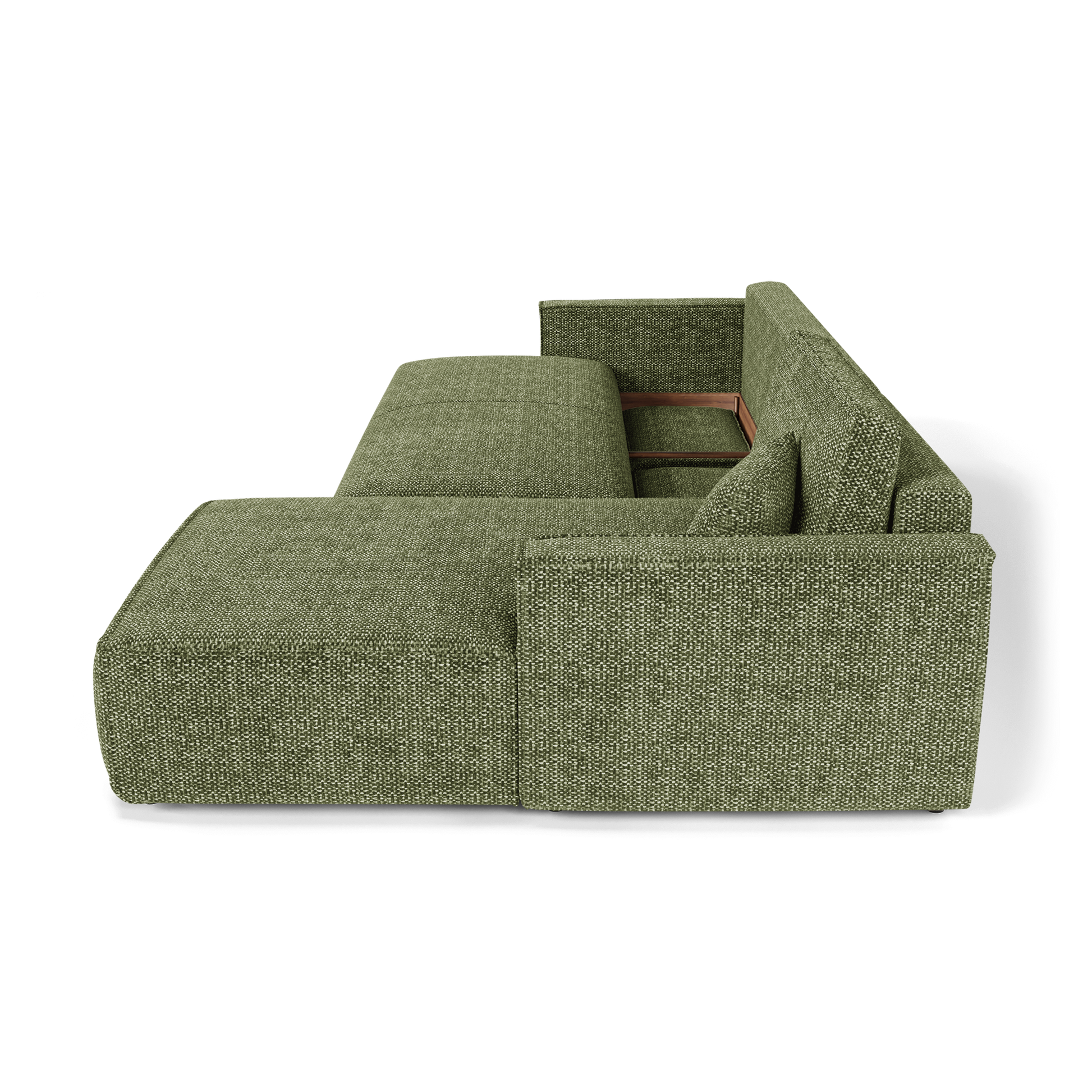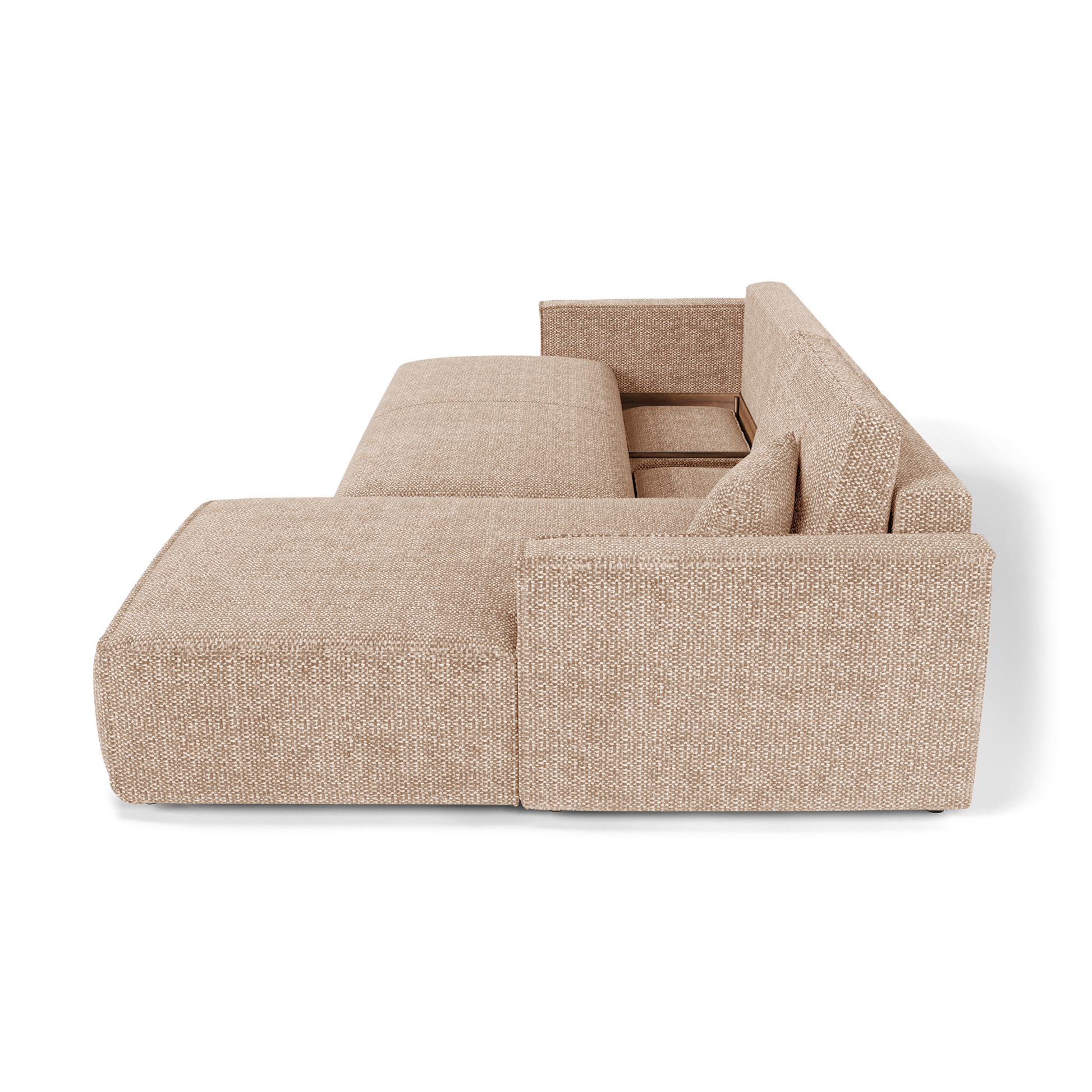 Sous son assise, un coffre de rangement spacieux et habillé d’une élégante finition noyer permet de stocker oreillers, couettes ou linge de maison, tout en gardant un salon parfaitement ordonné. Cette discrète solution de rangement souligne l’esprit pratique du modèle sans jamais compromettre son esthétique.