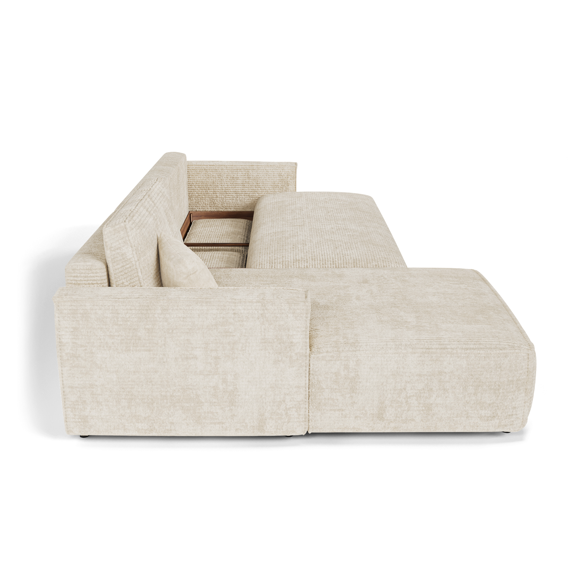 Sous son assise, un coffre de rangement spacieux et habillé d’une élégante finition noyer permet de stocker oreillers, couettes ou linge de maison, tout en gardant un salon parfaitement ordonné. Cette discrète solution de rangement souligne l’esprit pratique du modèle sans jamais compromettre son esthétique.