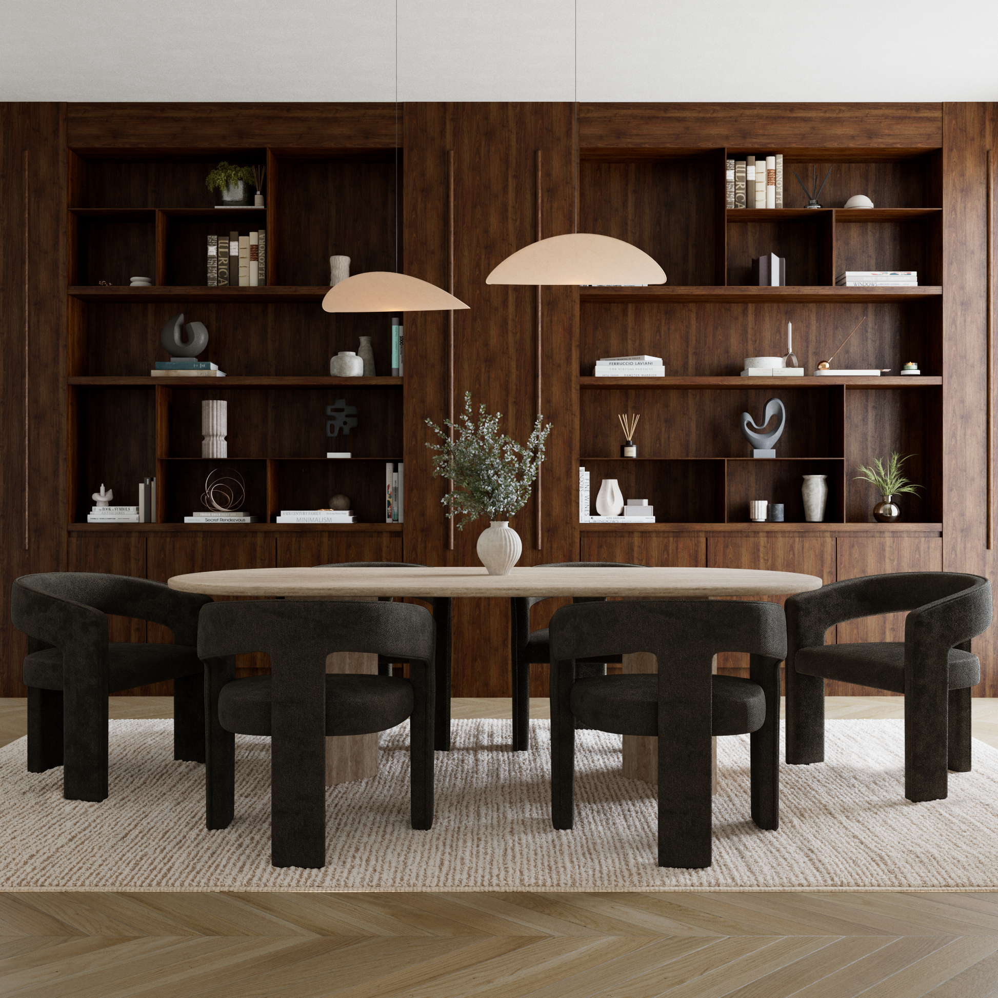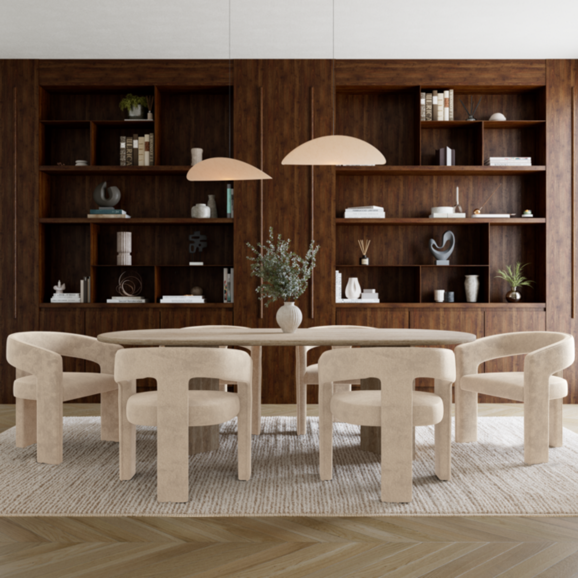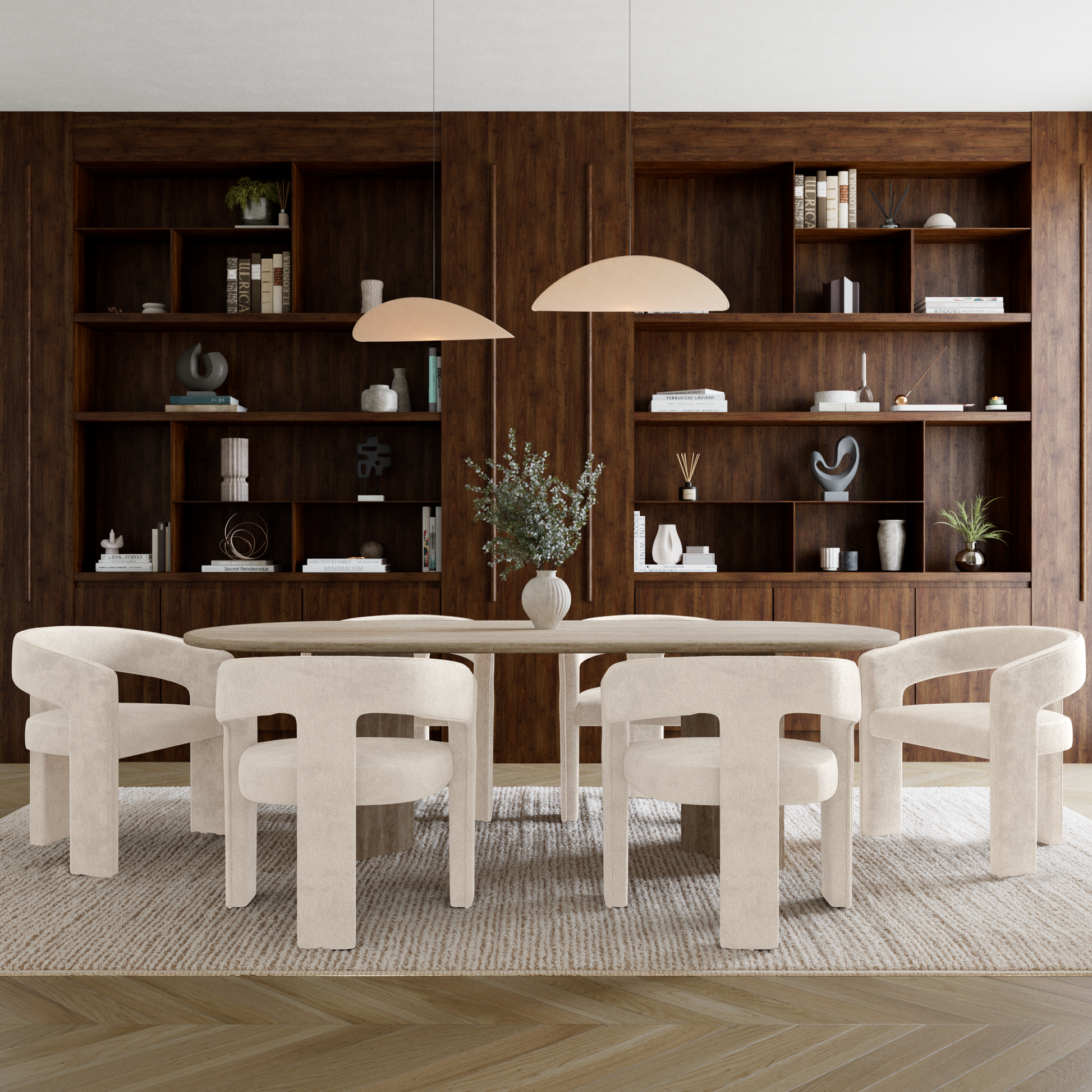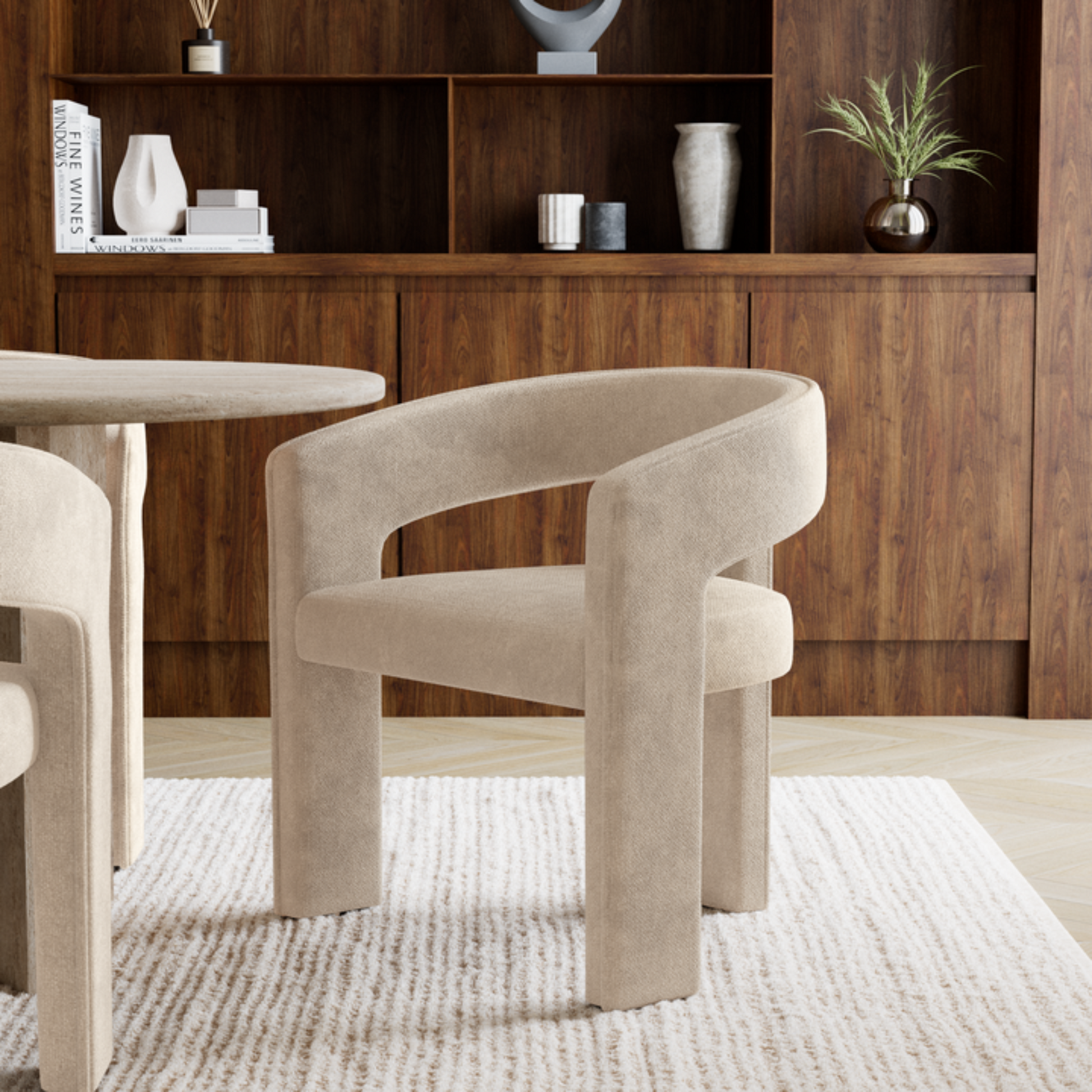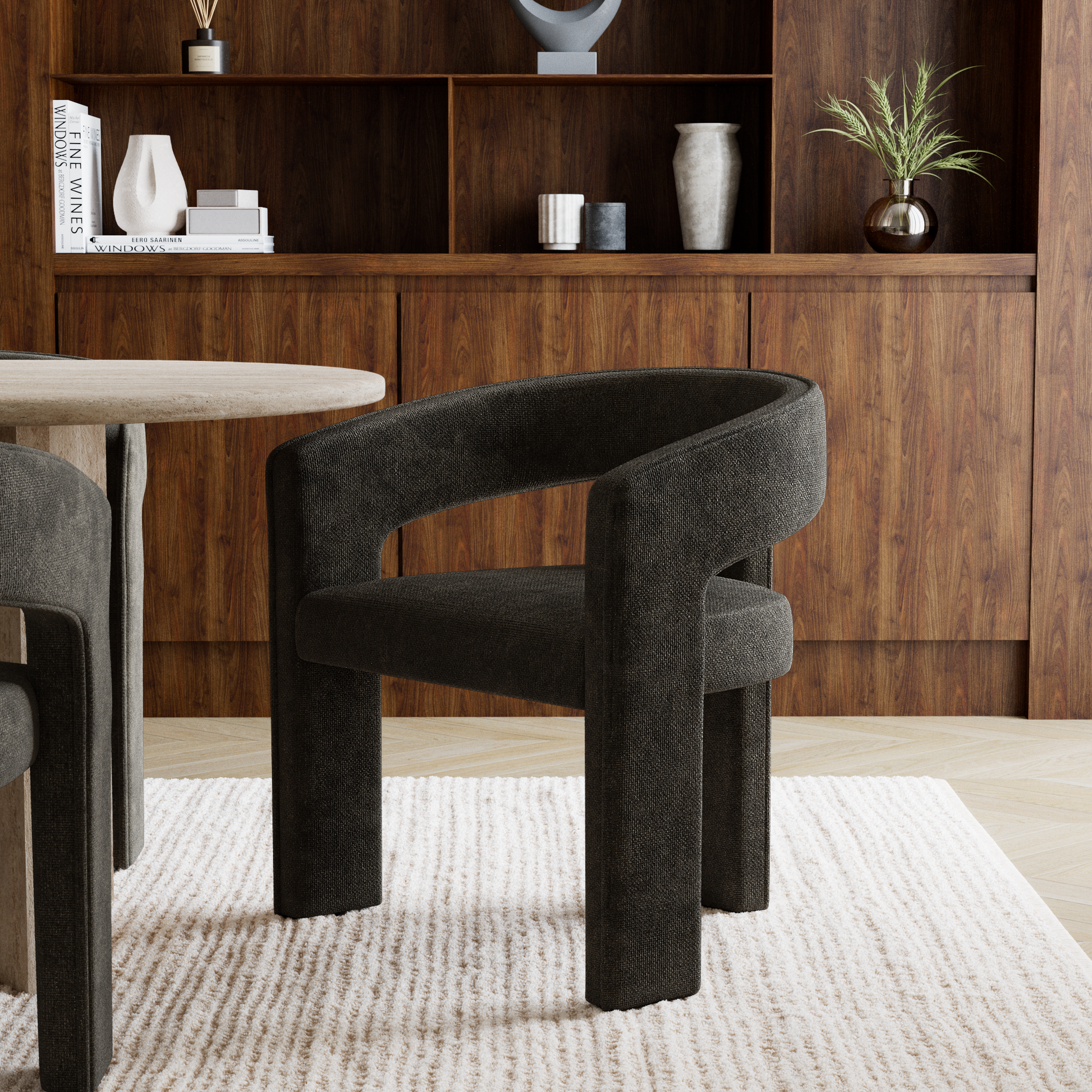 La chaise SARAH s’impose naturellement autour d’une table de salle à manger, dans un bureau élégant ou en chaise d’appoint dans un salon ou un hall. Sa forme enveloppante crée un véritable cocon visuel et fonctionnel : le dossier et les accoudoirs fusionnent en un seul geste fluide, structurant l’espace avec une grande modernité.