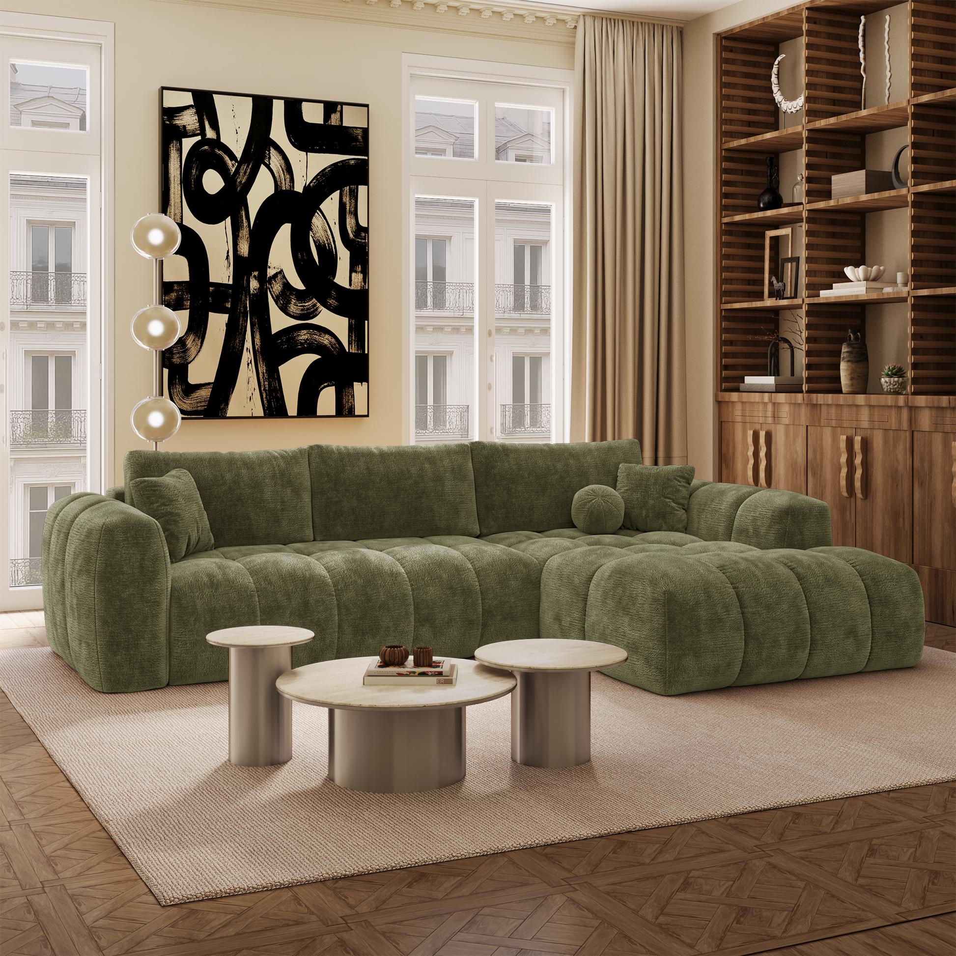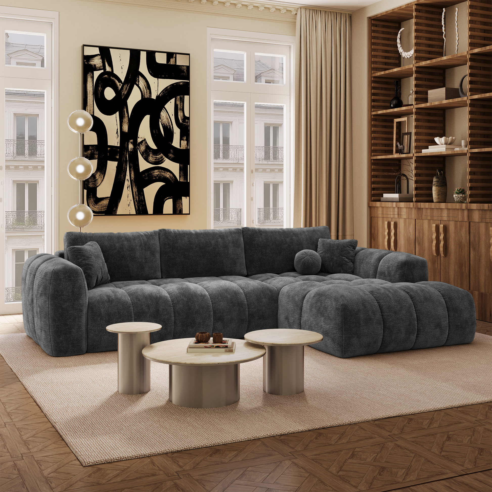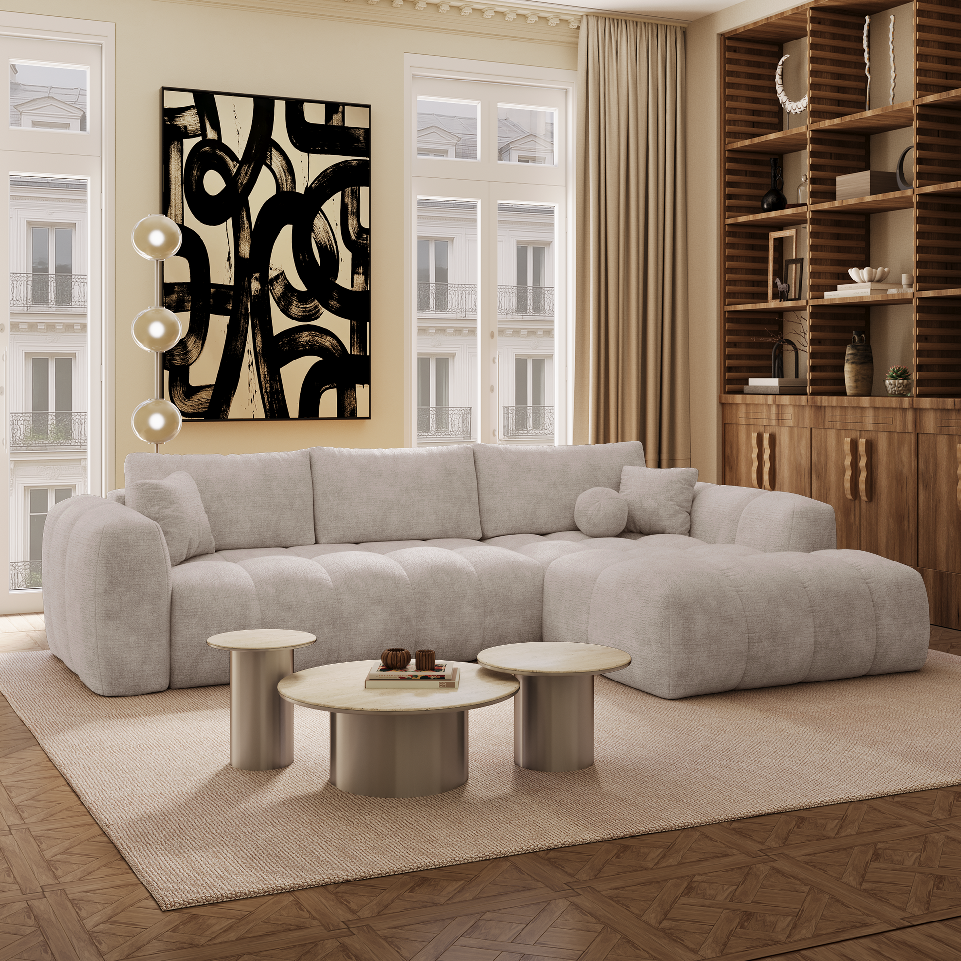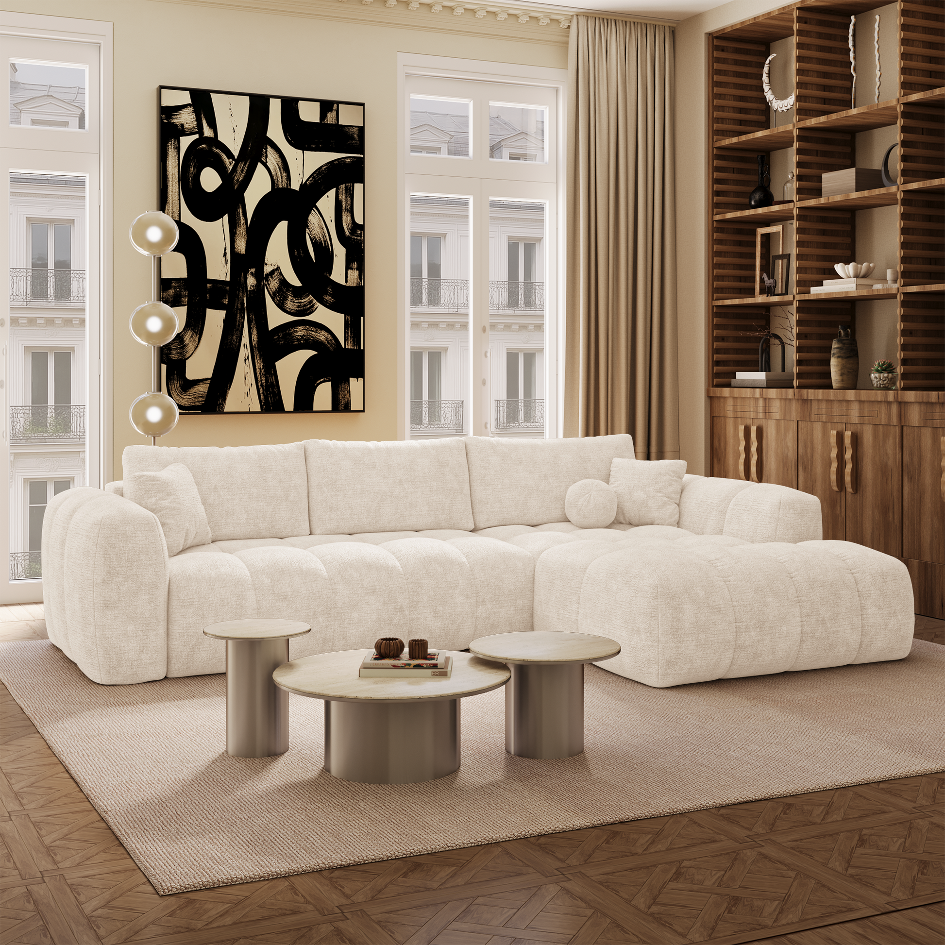 Son design tendance se distingue par des volumes enveloppants et des lignes équilibrées qui apportent immédiatement chaleur et modernité à votre salon. Il s’intègre facilement dans différents styles d’intérieur, qu’ils soient contemporains, minimalistes ou plus chaleureux.