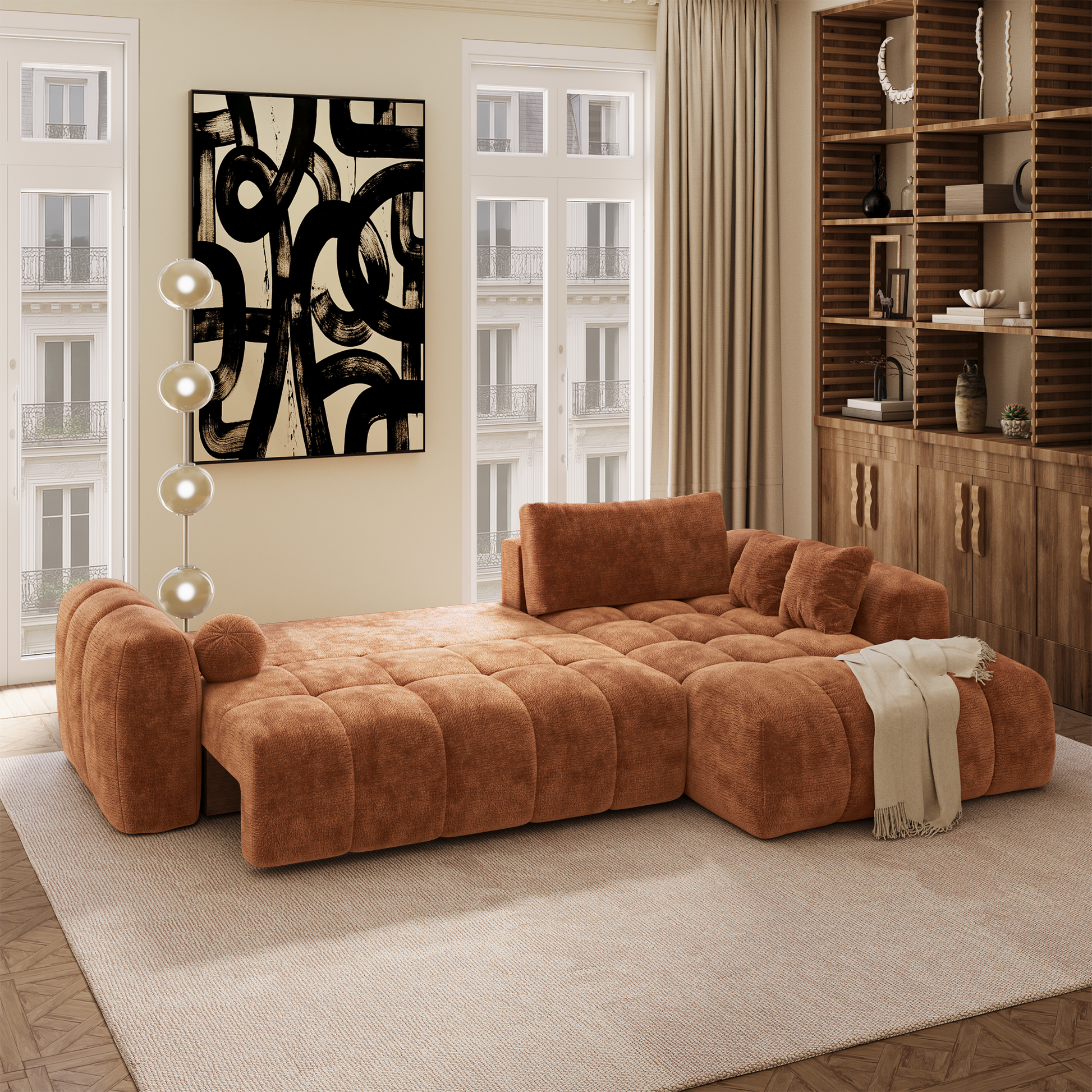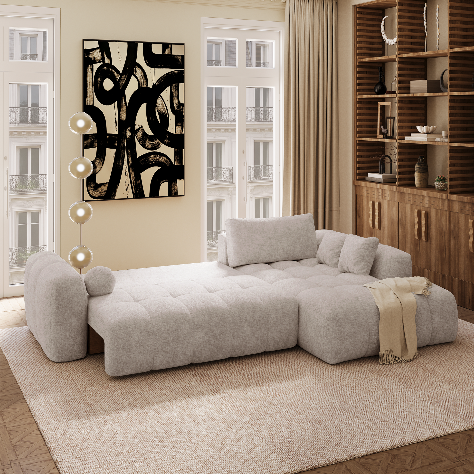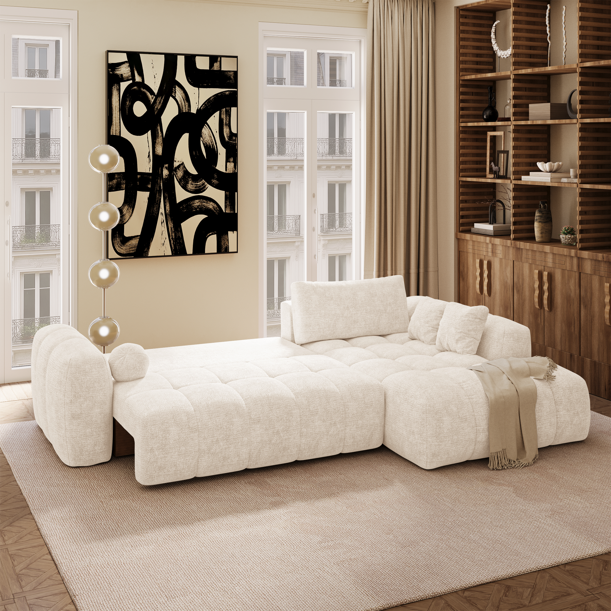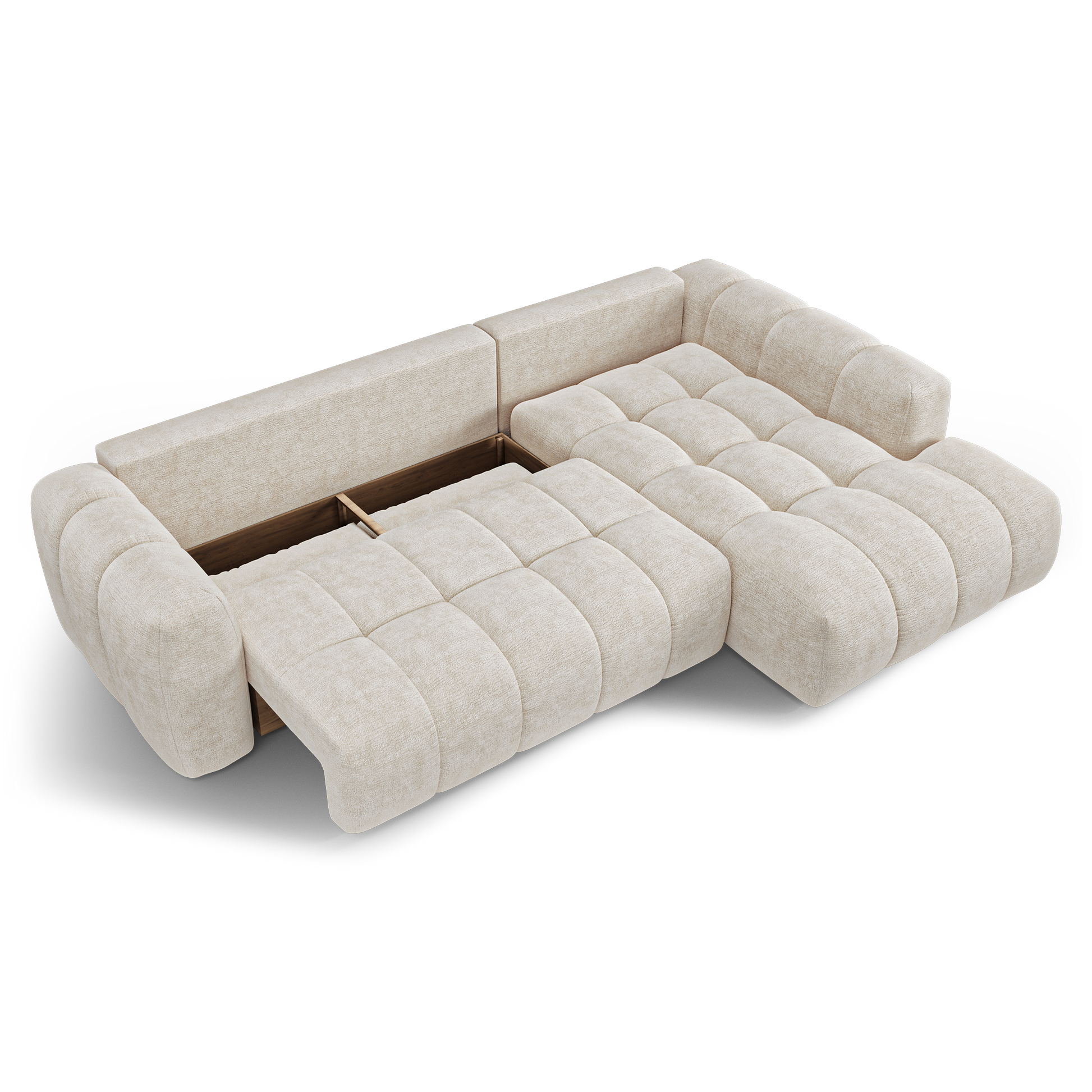 Autre avantage essentiel : son coffre de rangement intégré, discret et fonctionnel. Plaids, coussins, linge de lit ou accessoires trouvent naturellement leur place, permettant de garder un espace de vie organisé sans compromettre l’esthétique. Lorsque le canapé est déplié, vous pouvez même y ranger les coussins du dossier.