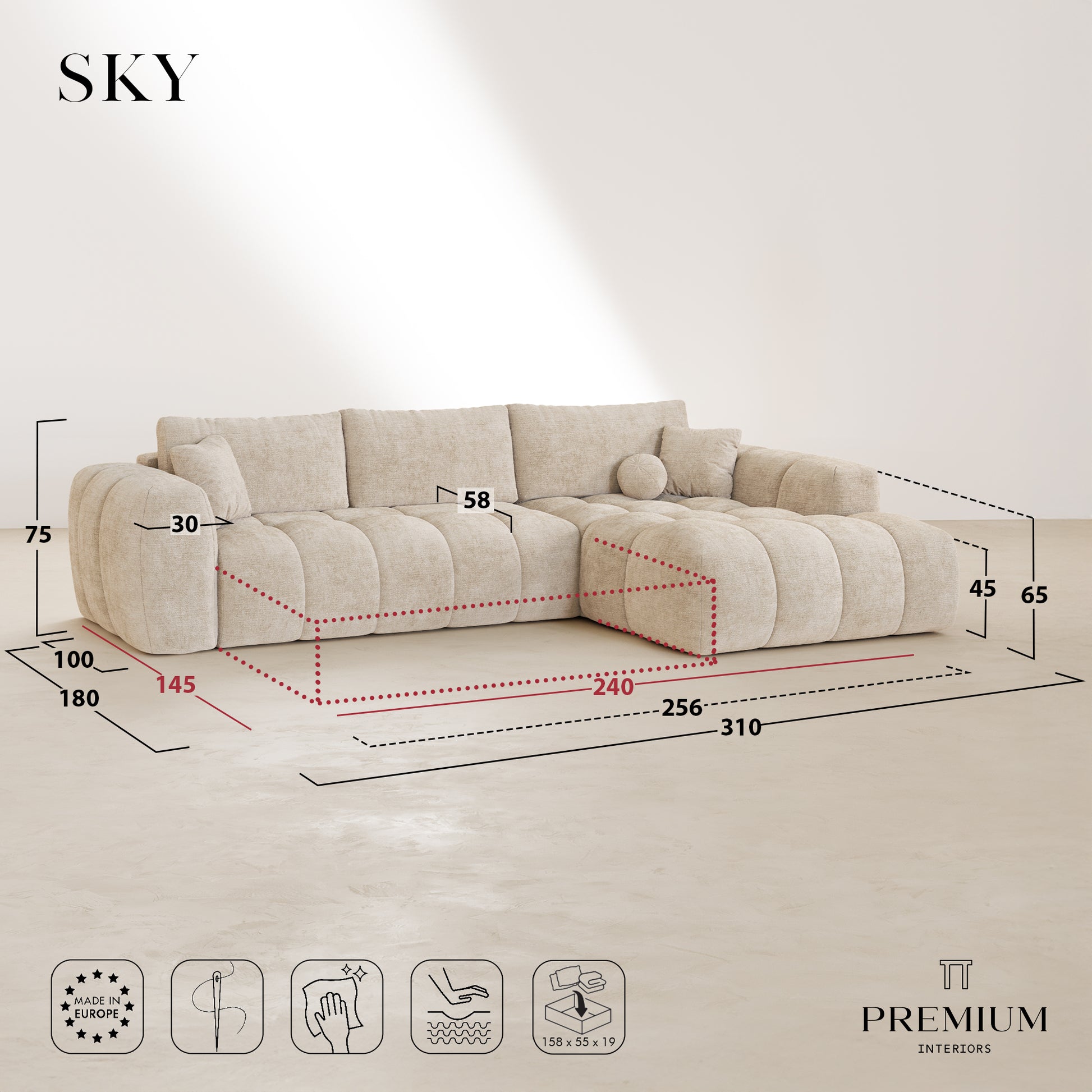 Pensé pour les intérieurs actuels et la vie de famille, le canapé d’angle SKY combine design contemporain, confort généreux et fonctionnalité intelligente. Avec ses 310 cm de longueur, il offre un espace idéal pour se réunir, se détendre ou recevoir, tout en conservant une silhouette élégante et actuelle.