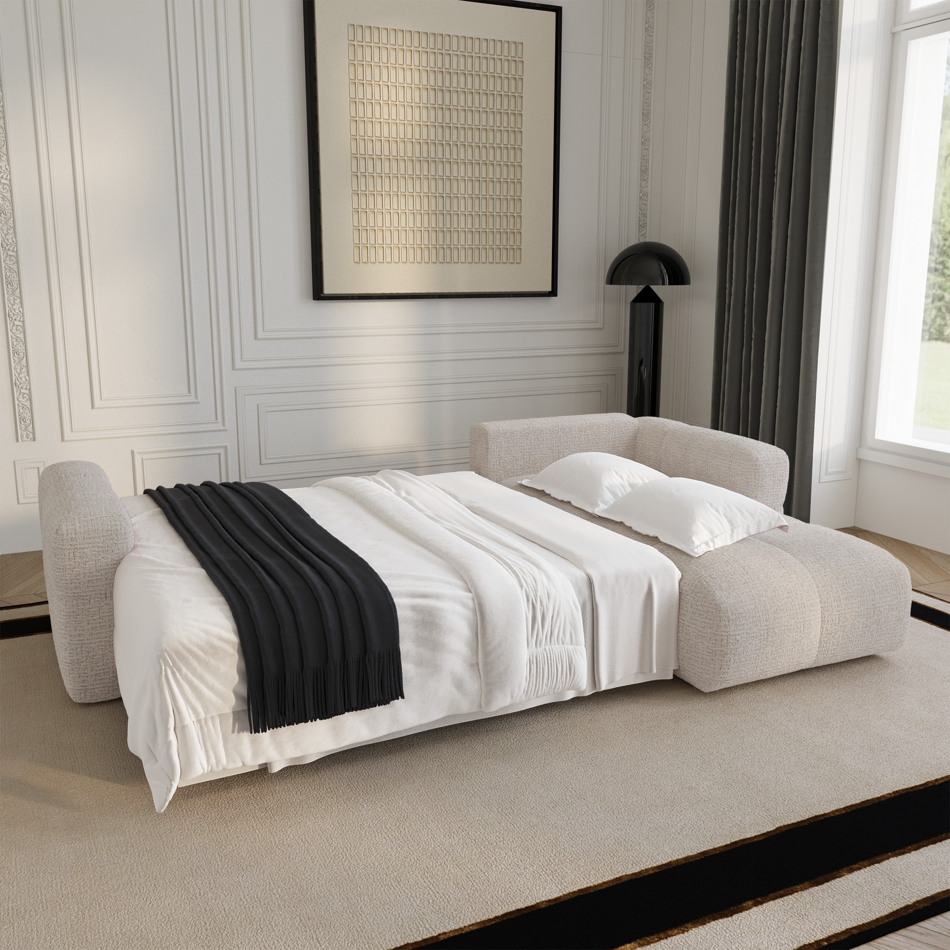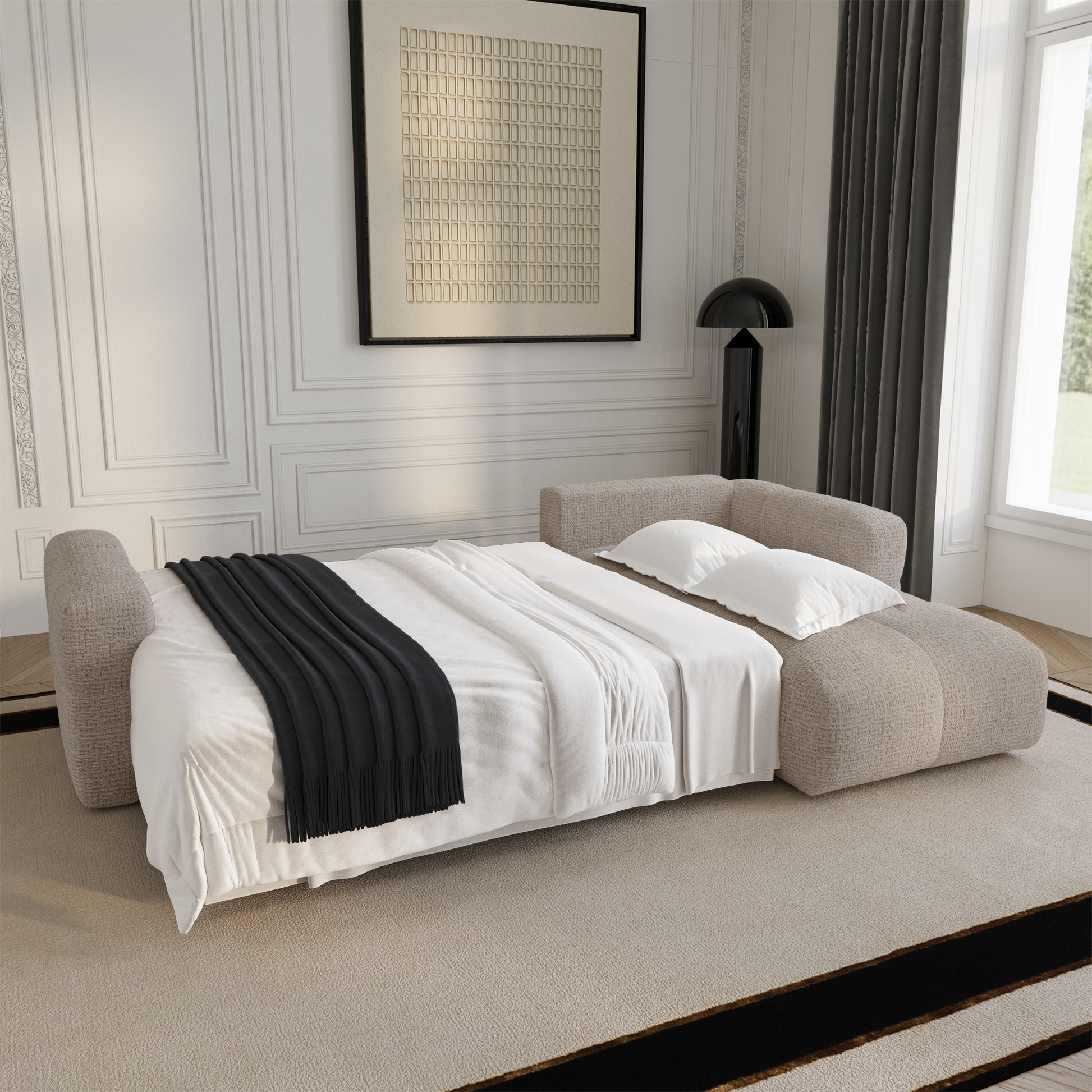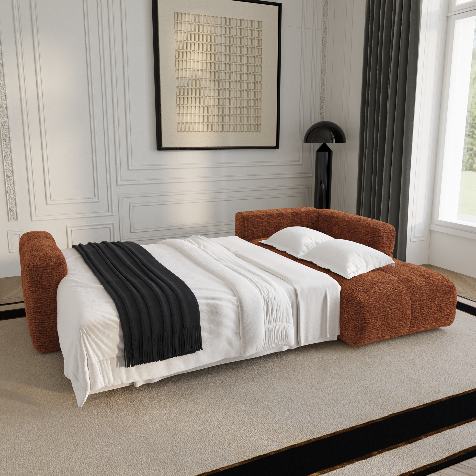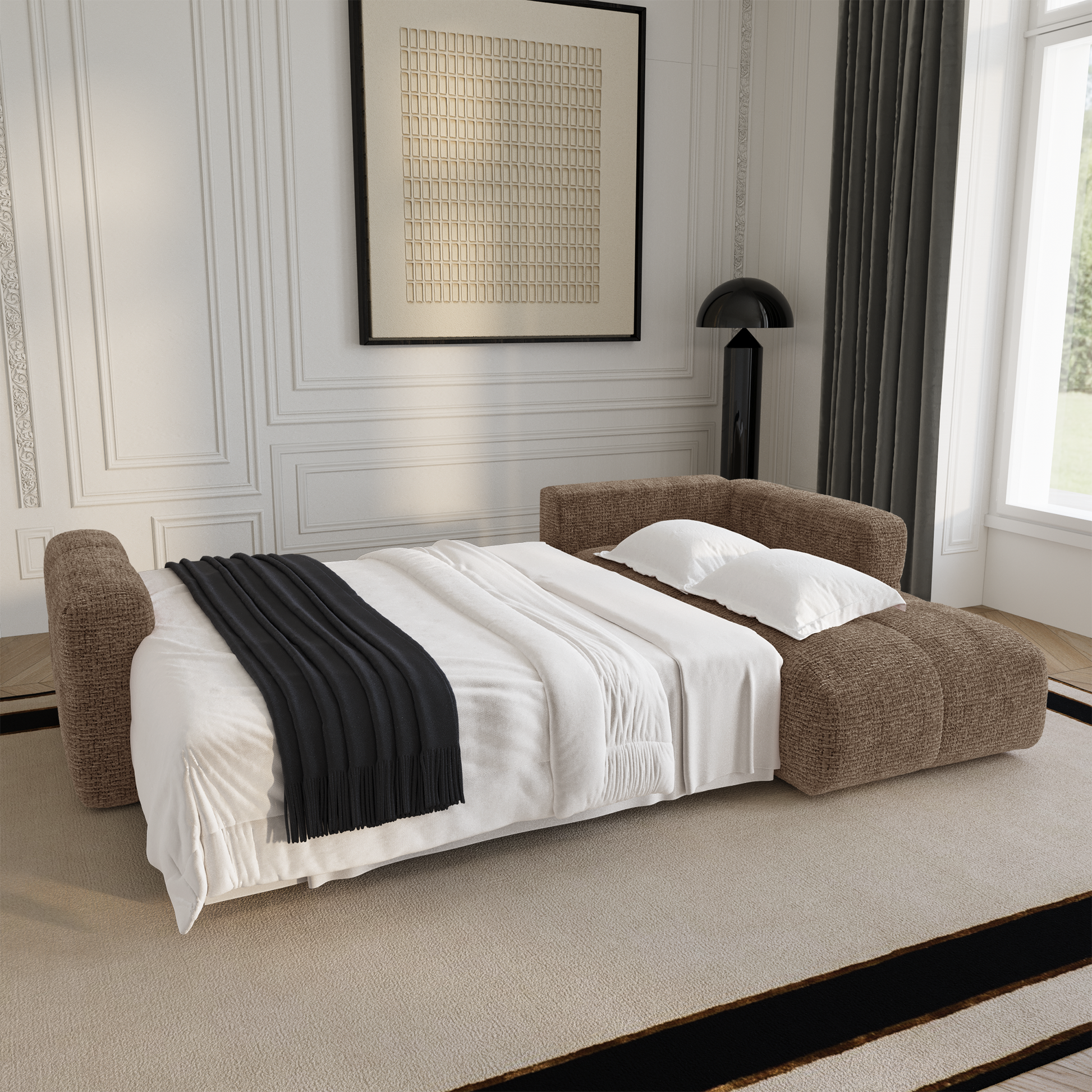 Son système intuitif permet d'installer un espace couchage en un instant, offrant ainsi une solution parfaite pour accueillir des invités avec tout le confort nécessaire. Son coffre de rangement noyer en fait un canapé aussi pratique qu'esthétique.