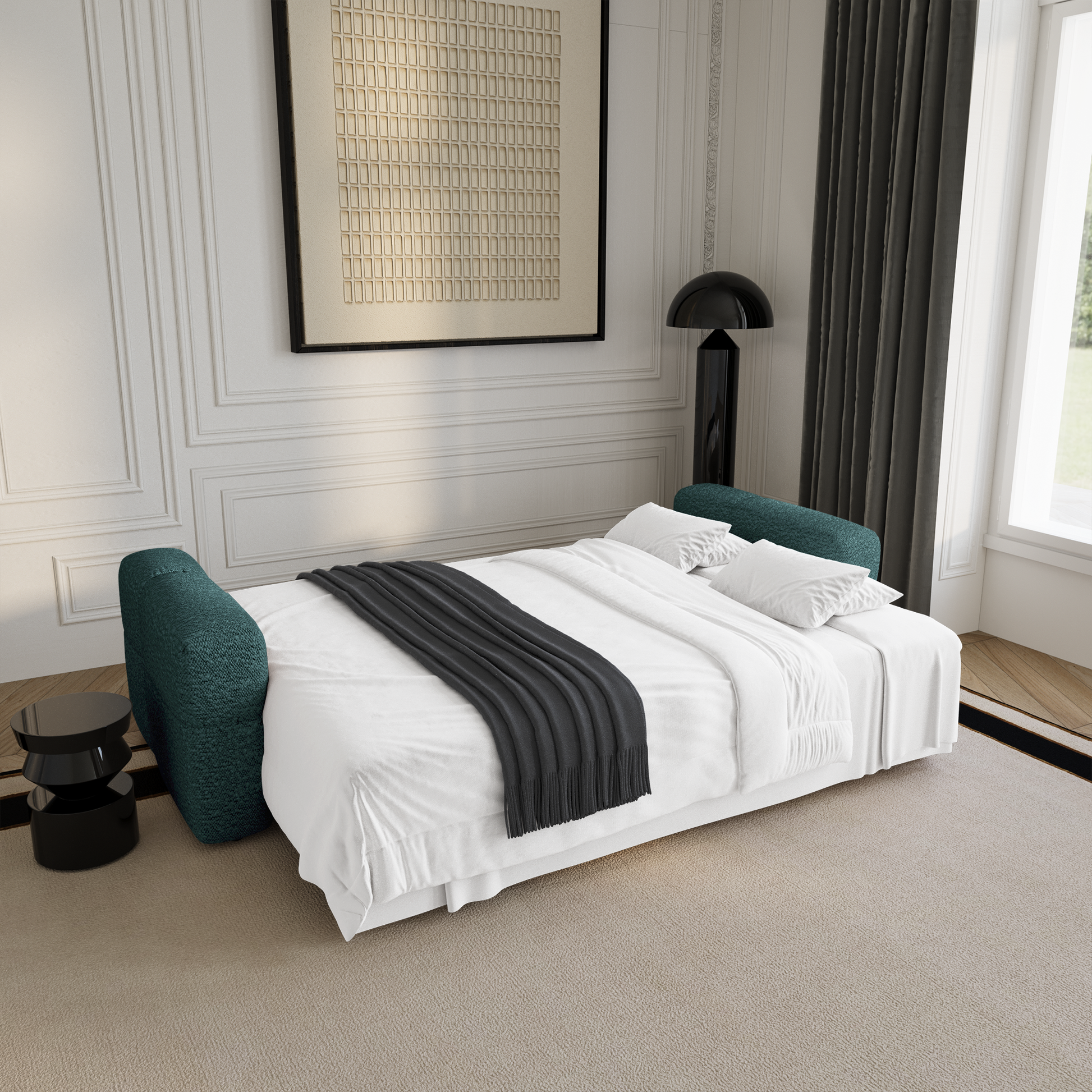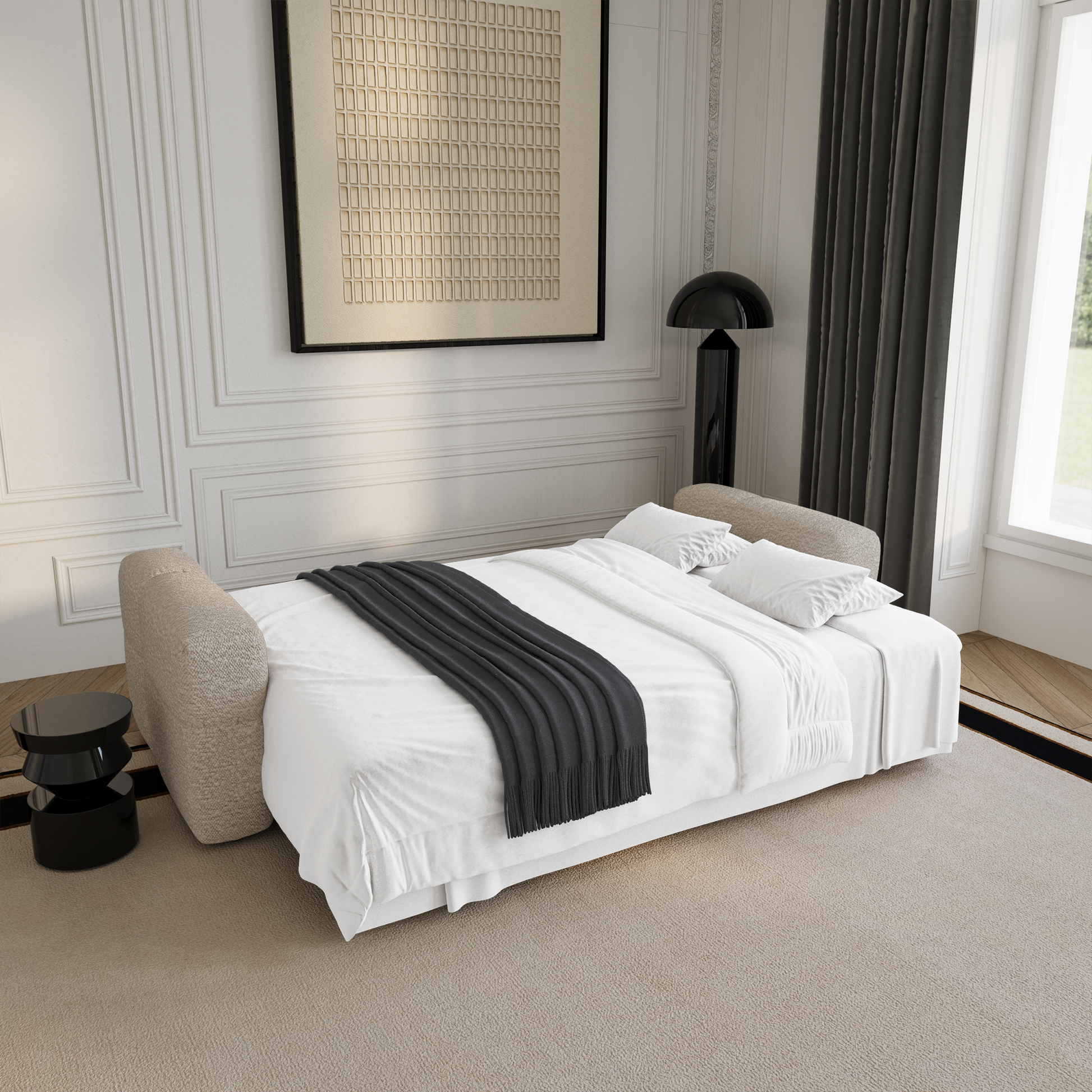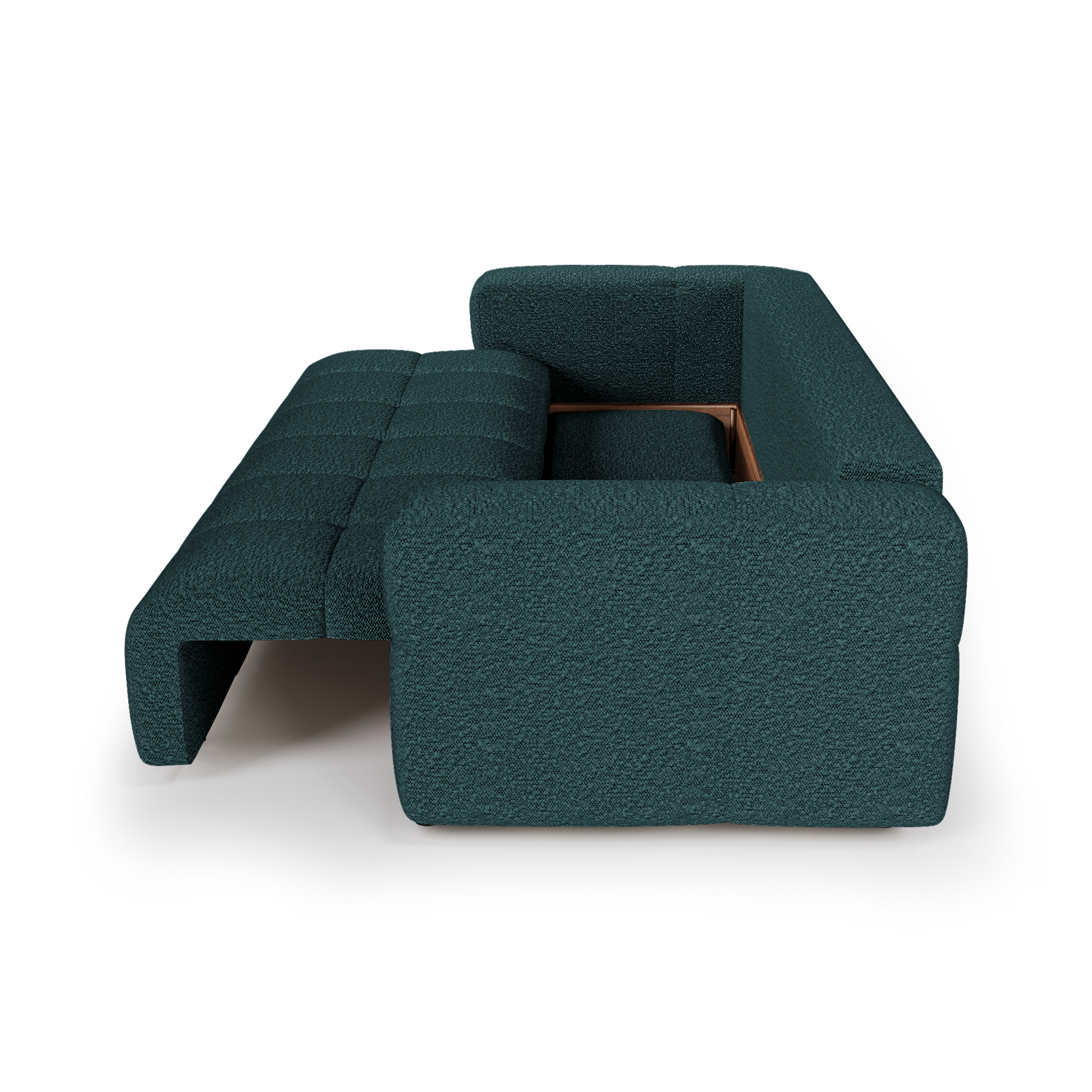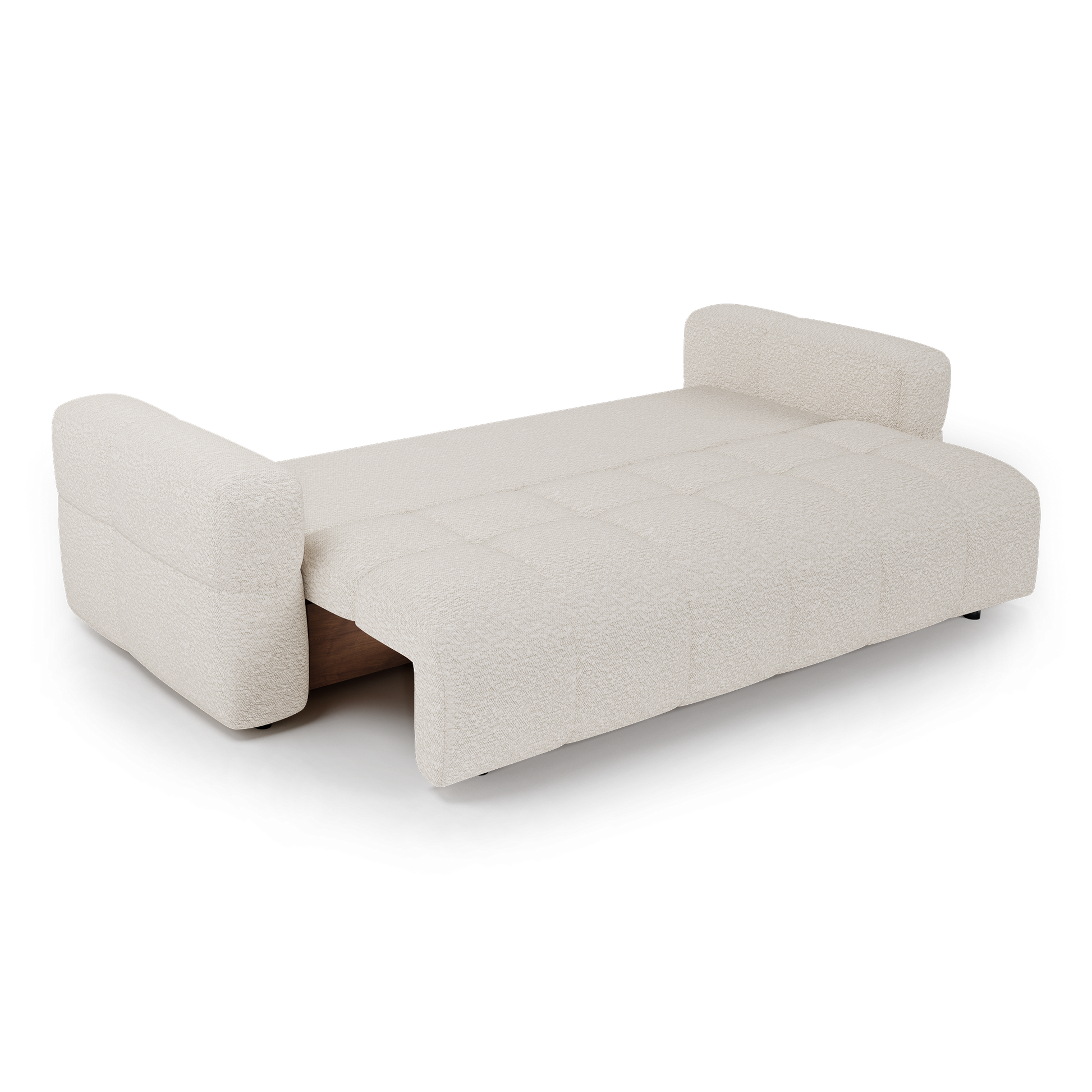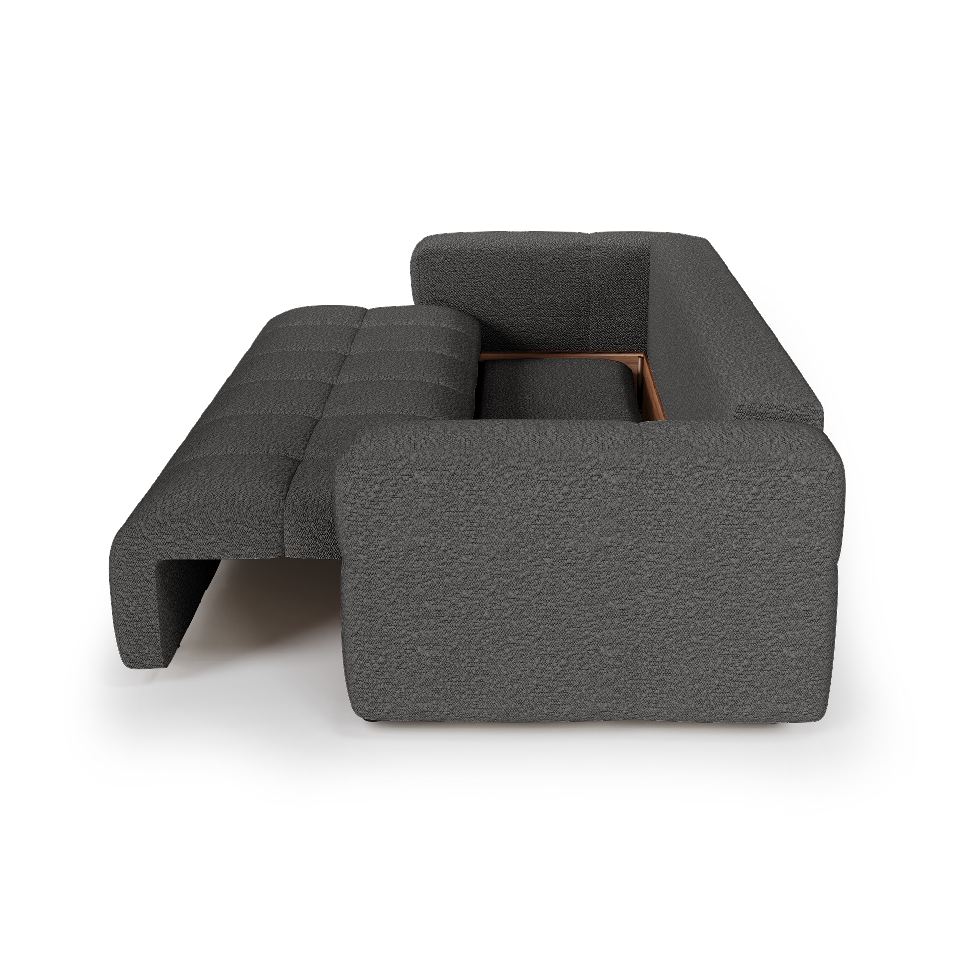Le canapé VIBE combine style et fonctionnalité, avec ses courbes arrondies au design tendance, son coffre de rangement noyer aussi pratique qu’esthétique et son couchage confortable et dépliable en un clin d'oeil.