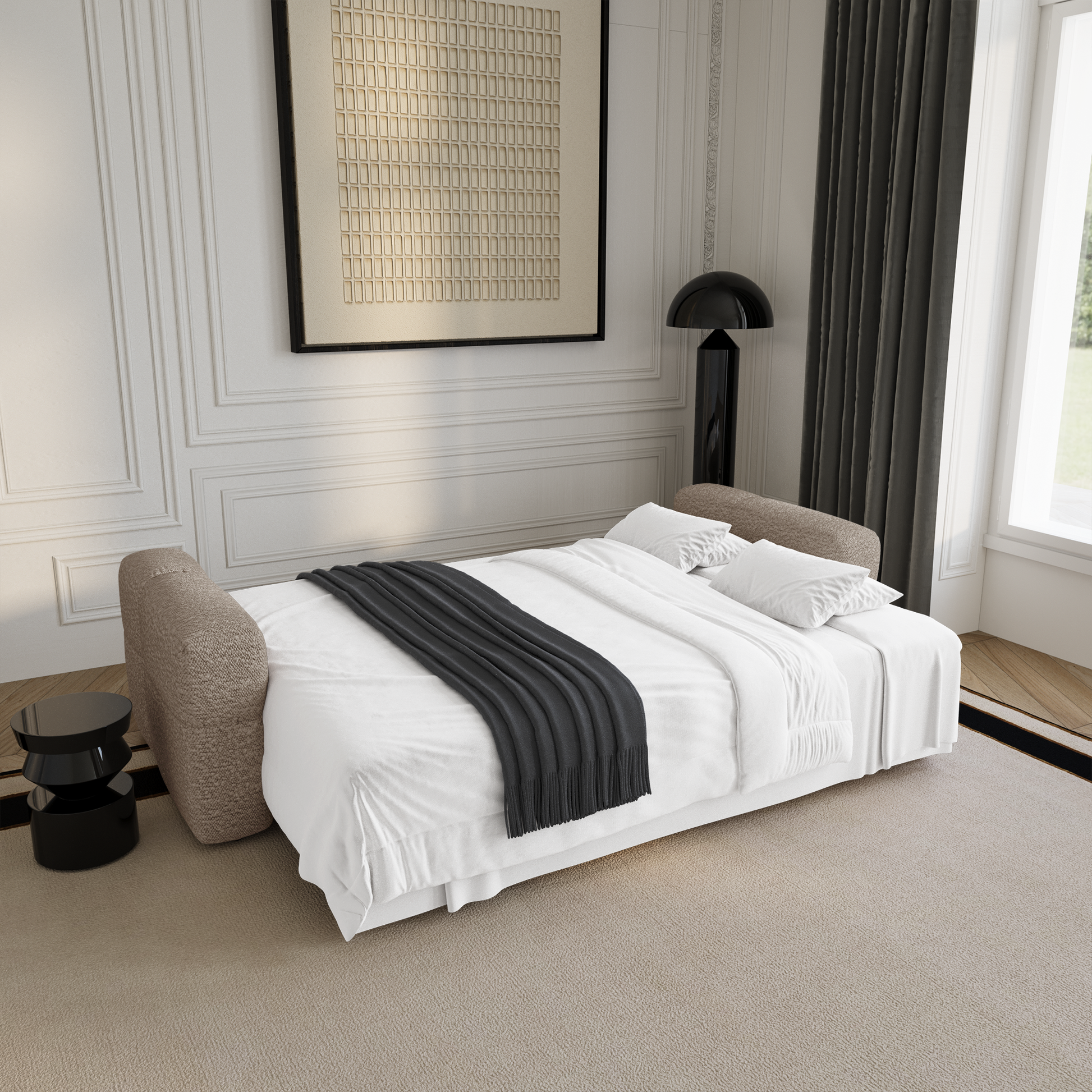 Son système intuitif permet d'installer un espace couchage en un instant, offrant ainsi une solution parfaite pour accueillir des invités avec tout le confort nécessaire. Son coffre de rangement noyer en fait un canapé aussi pratique qu'esthétique.